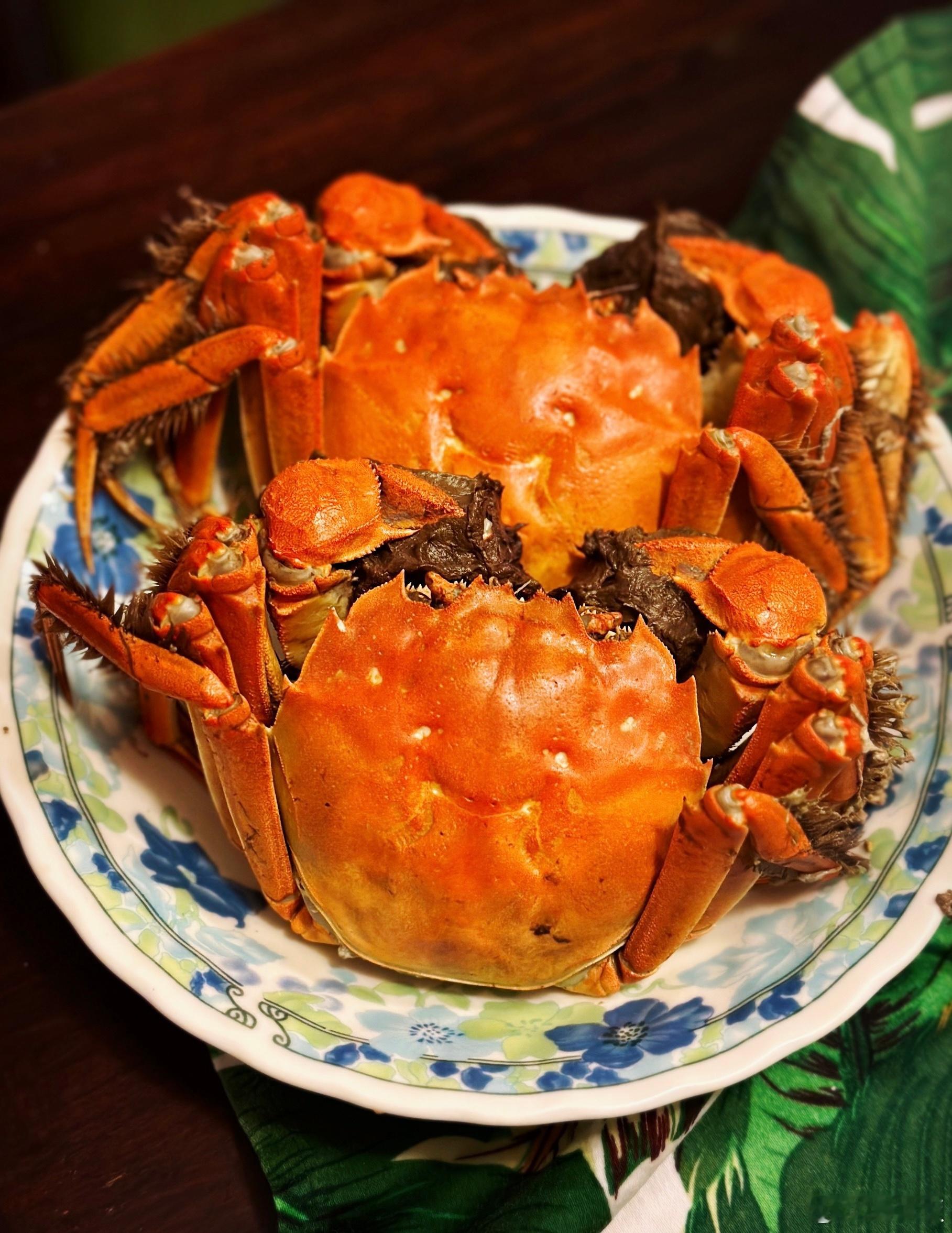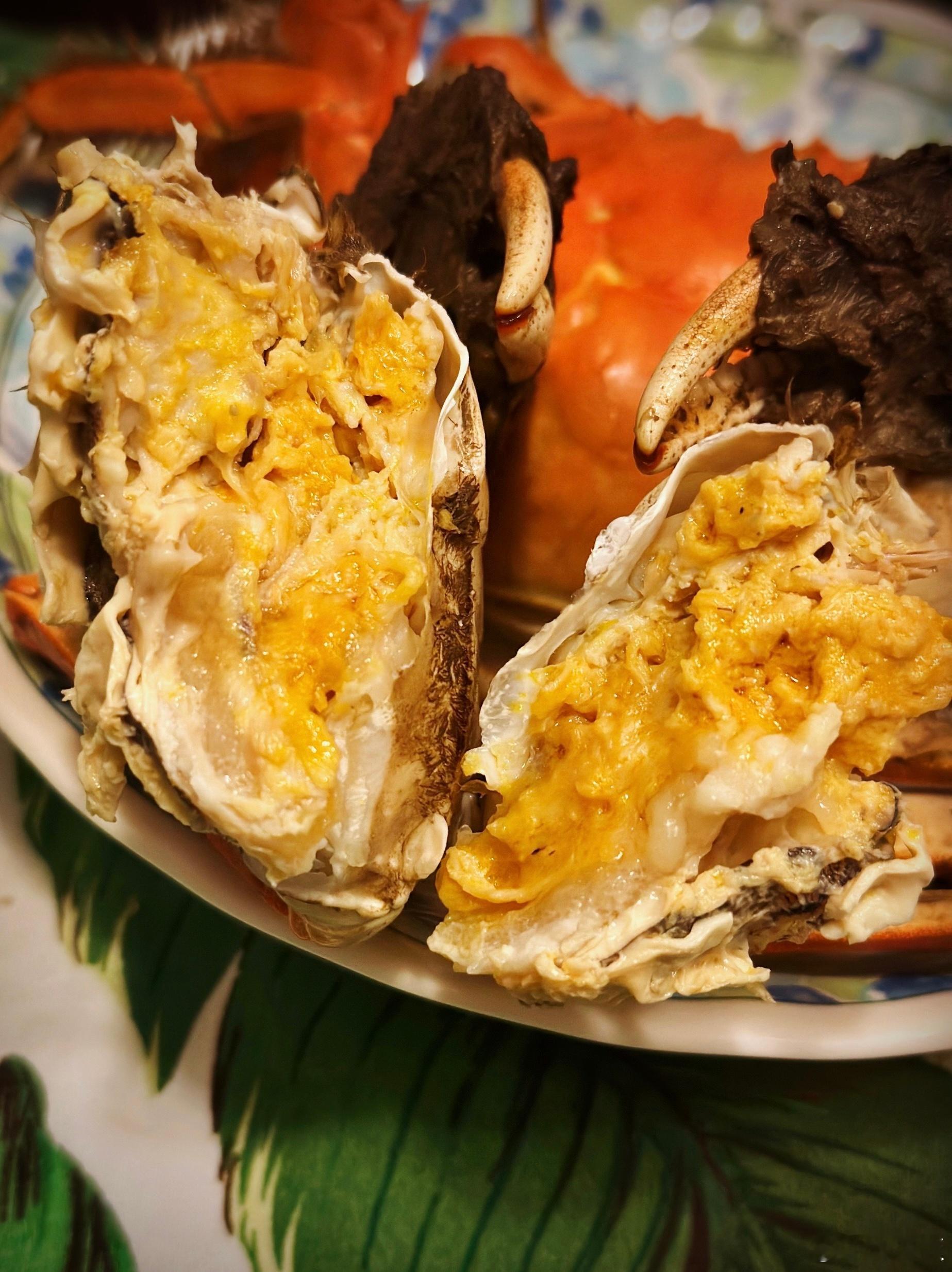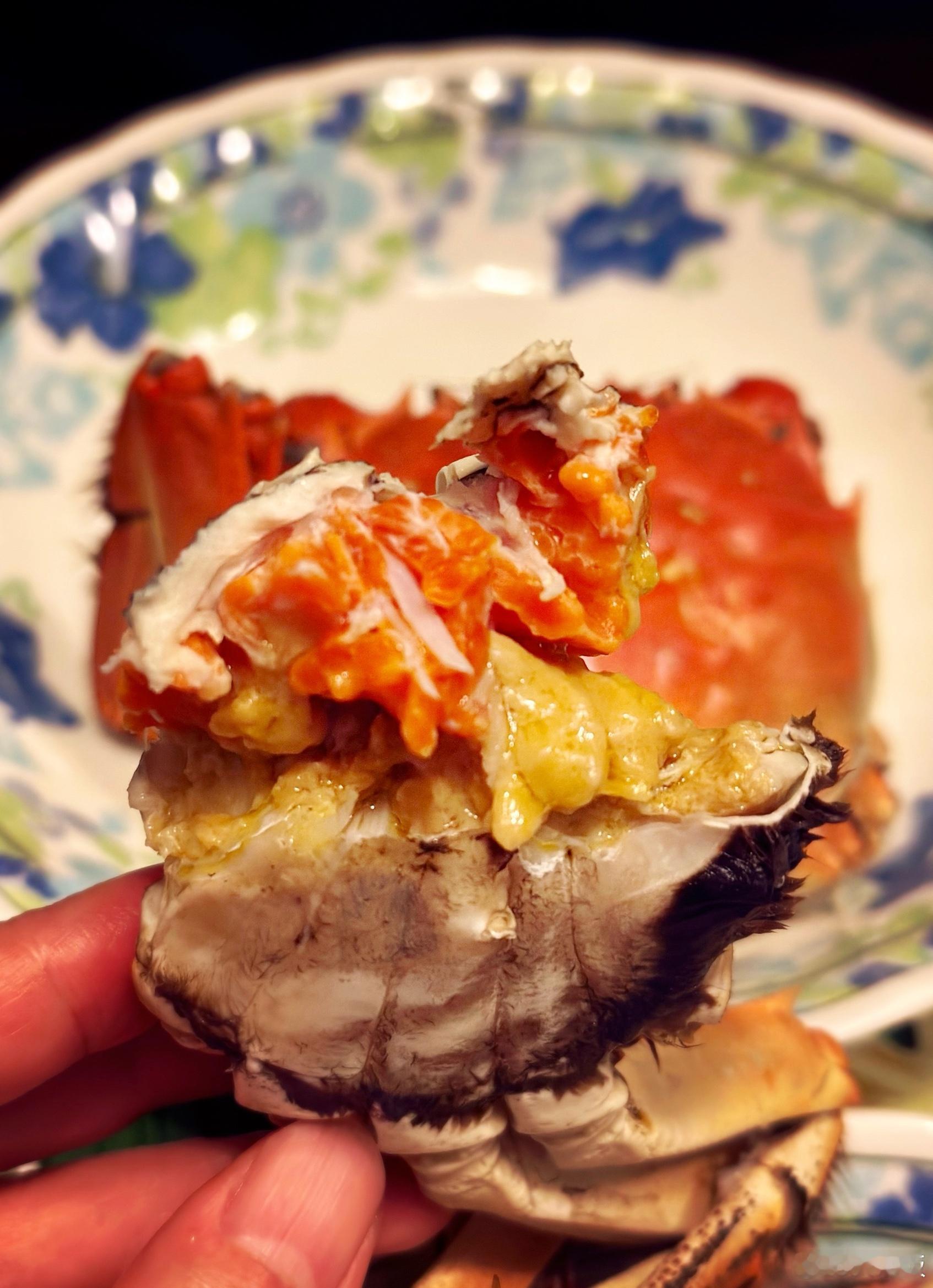 道道鲜送来一砂锅红烧羊肉,自己加了萝卜,一把青蒜叶,香煞人,崇明矮脚小菠菜,昆布盐油盐水焯一下就清甜而糯;黄芽菜冬笋烂糊肉丝。冷天的蔬菜真比荤菜还好吃。大闸蟹每年还是要喫一两次的。今年仍是高邮湖的蟹王,雌蟹六两雄蟹七两。蟹一喫,这顿饭时间就长了,日脚就慢了。还是出去散散步。今晚月亮仍然又圆又亮。回家剖橙子。喫过橙子,手上的蟹腥气也祛净了。所以总觉得应是“橙黄蟹肥时”,比“橙黄橘绿”更般配些。半间灶披间菜单