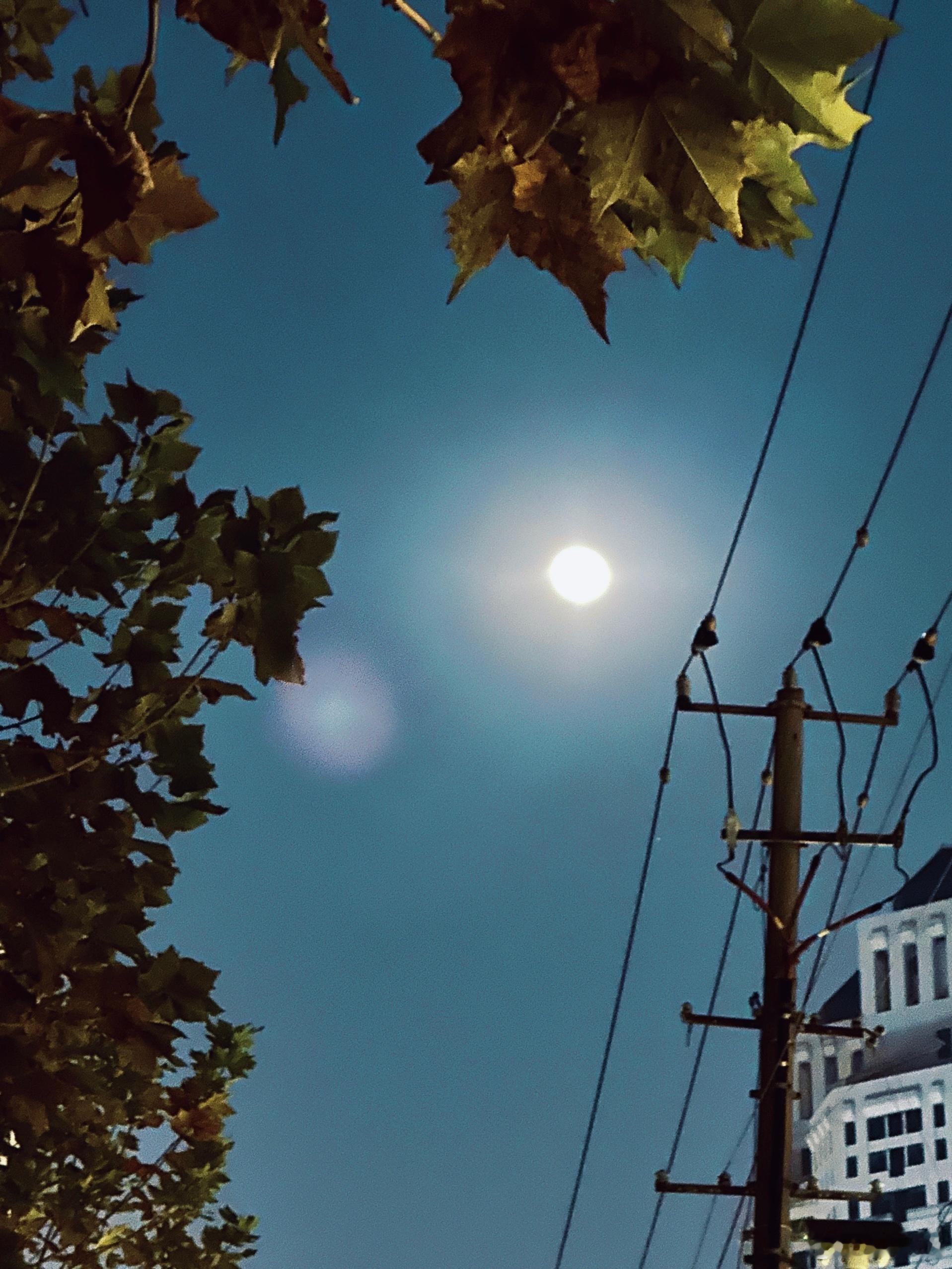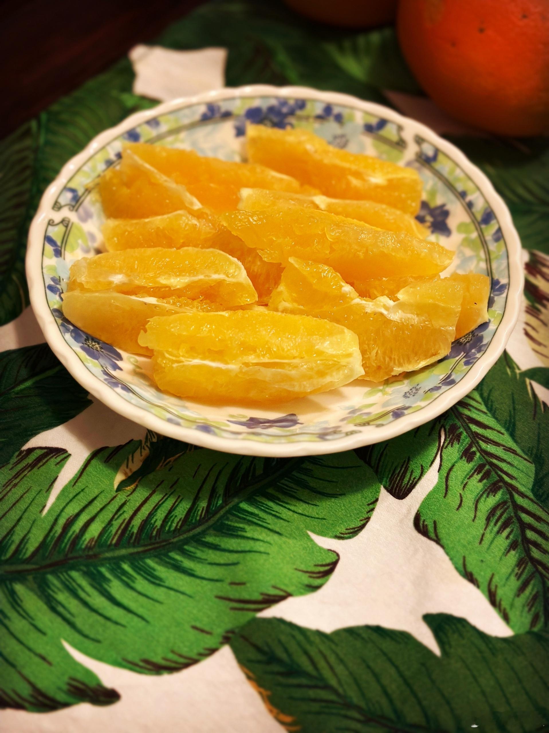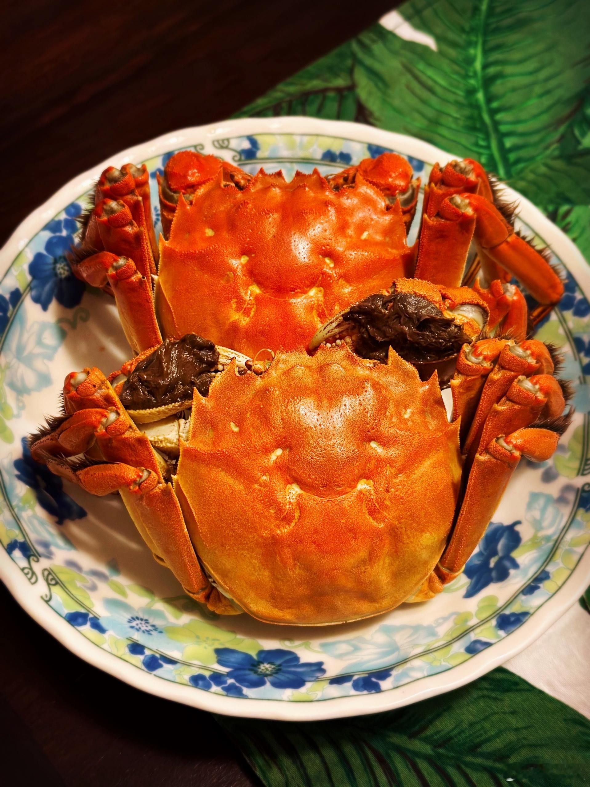 道道鲜送来一砂锅红烧羊肉,自己加了萝卜,一把青蒜叶,香煞人,崇明矮脚小菠菜,昆布盐油盐水焯一下就清甜而糯;黄芽菜冬笋烂糊肉丝。冷天的蔬菜真比荤菜还好吃。大闸蟹每年还是要喫一两次的。今年仍是高邮湖的蟹王,雌蟹六两雄蟹七两。蟹一喫,这顿饭时间就长了,日脚就慢了。还是出去散散步。今晚月亮仍然又圆又亮。回家剖橙子。喫过橙子,手上的蟹腥气也祛净了。所以总觉得应是“橙黄蟹肥时”,比“橙黄橘绿”更般配些。半间灶披间菜单