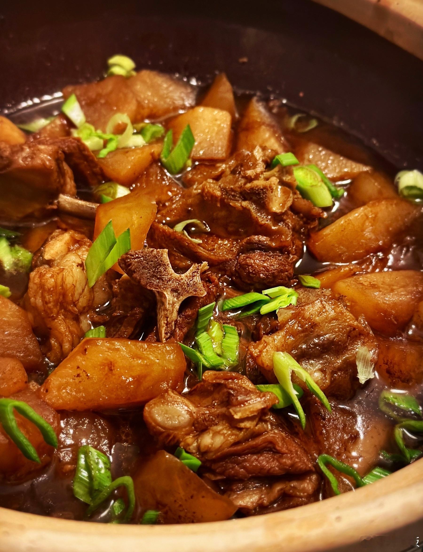道道鲜送来一砂锅红烧羊肉,自己加了萝卜,一把青蒜叶,香煞人,崇明矮脚小菠菜,昆布