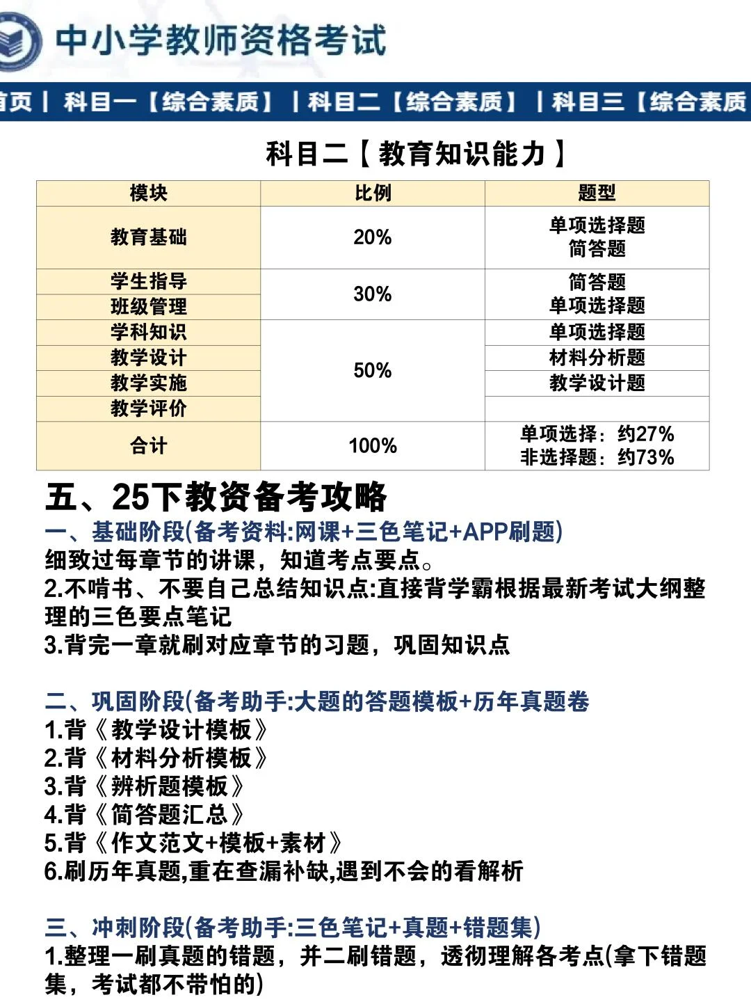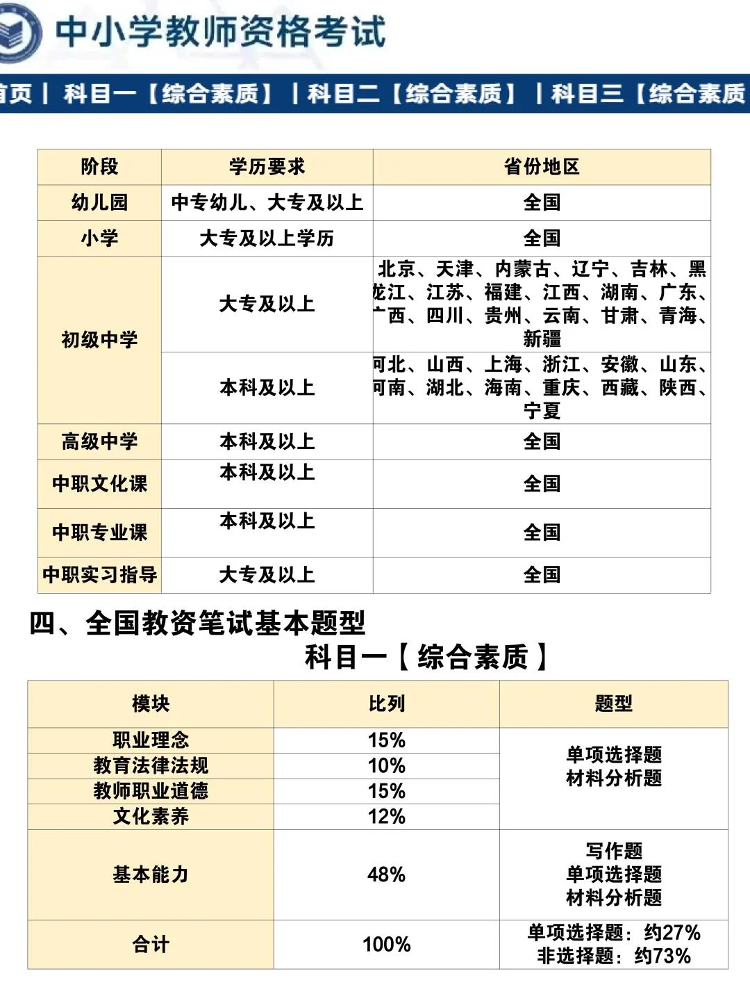 • 教育知识:教育学+心理学基础 • 科目三:根据学段选择对应学科