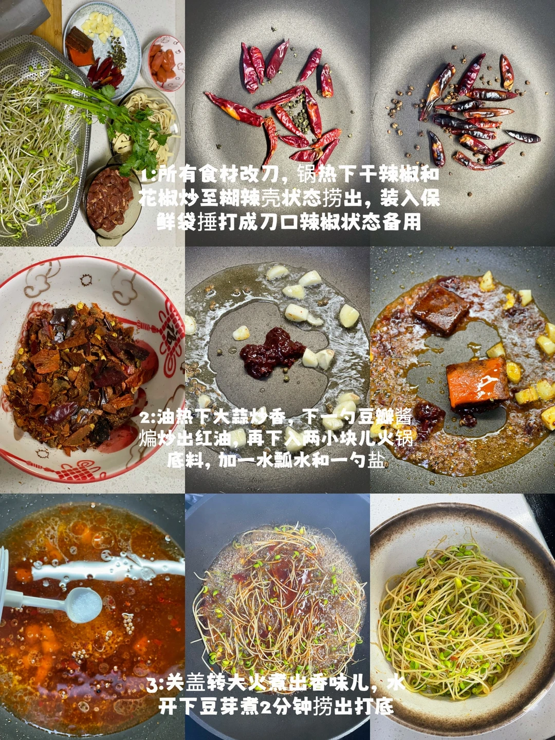 🧾食材:牛肉,豆芽,千张,脆皮肠,火锅底料,大蒜,花椒,香菜(素菜可随意切换,自己喜欢的都🉑️)