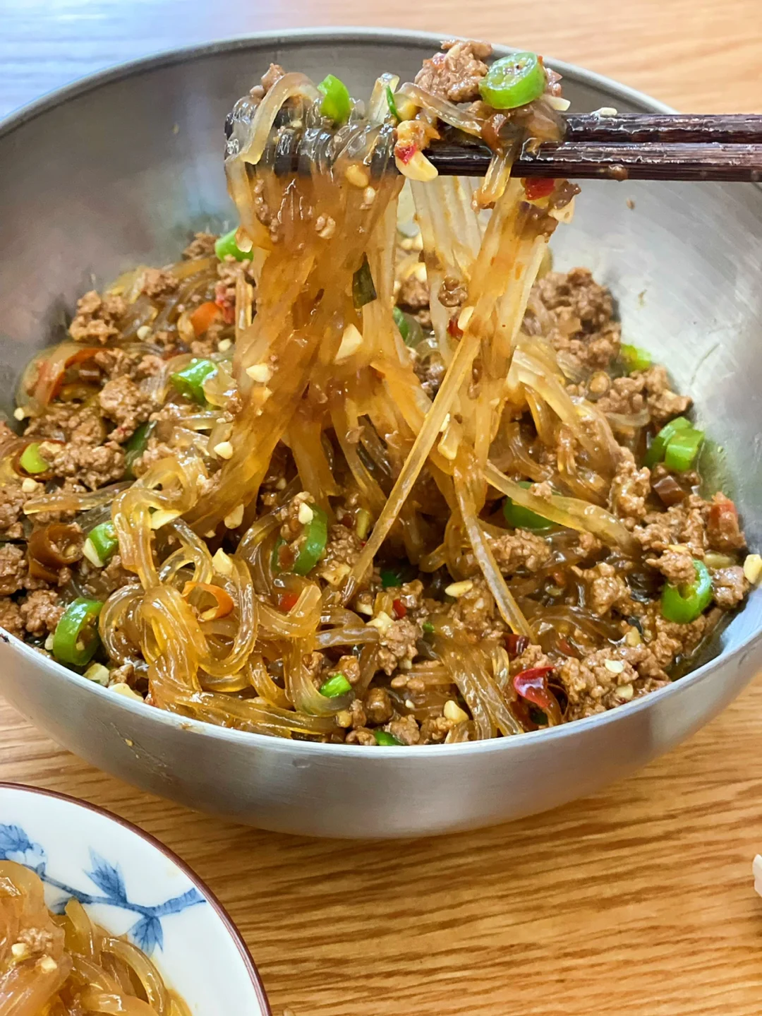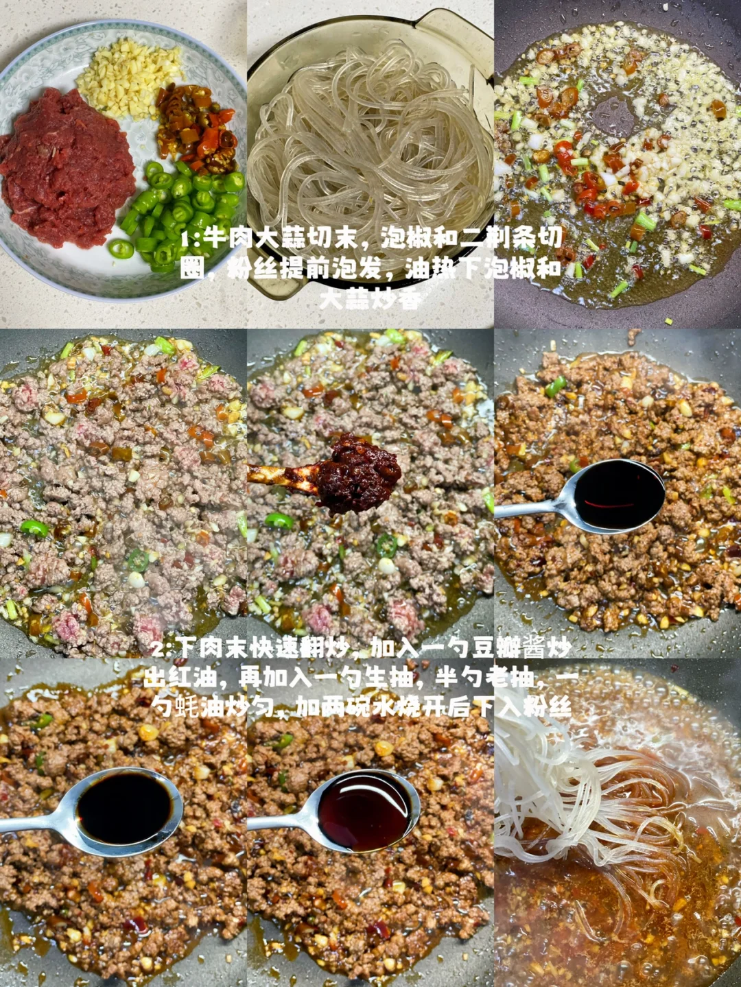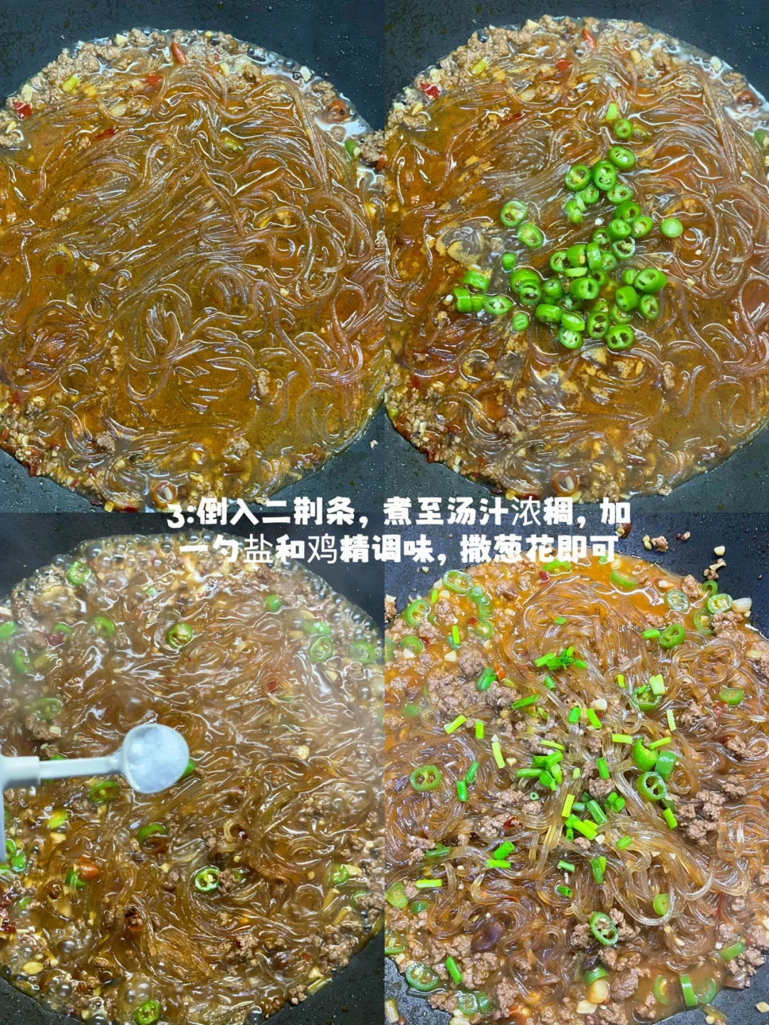 汁鲜入味的肉末粉丝煲,浓郁的汤汁包裹着粉丝,吸溜吸溜一大盘,强烈推荐‼️做法超简单还巨下饭🍚🍚🍚 🧾食材:牛肉,粉丝,泡椒,二荆条 👩🍳做法简单 1⃣️:牛肉洗净切末,大蒜切末,泡椒和二荆条切成小圈,粉丝提前泡软 2⃣️:油热下大蒜和泡椒炒香,倒入肉末快速翻炒,加一勺豆瓣酱炒出红油,再加入一勺生抽,半勺老抽,一勺蚝油炒匀 3⃣️:加两碗清水煮开,下粉丝拌匀,下二荆条,加一勺盐和一勺鸡精调味,煮至汤汁浓稠,撒葱花出锅