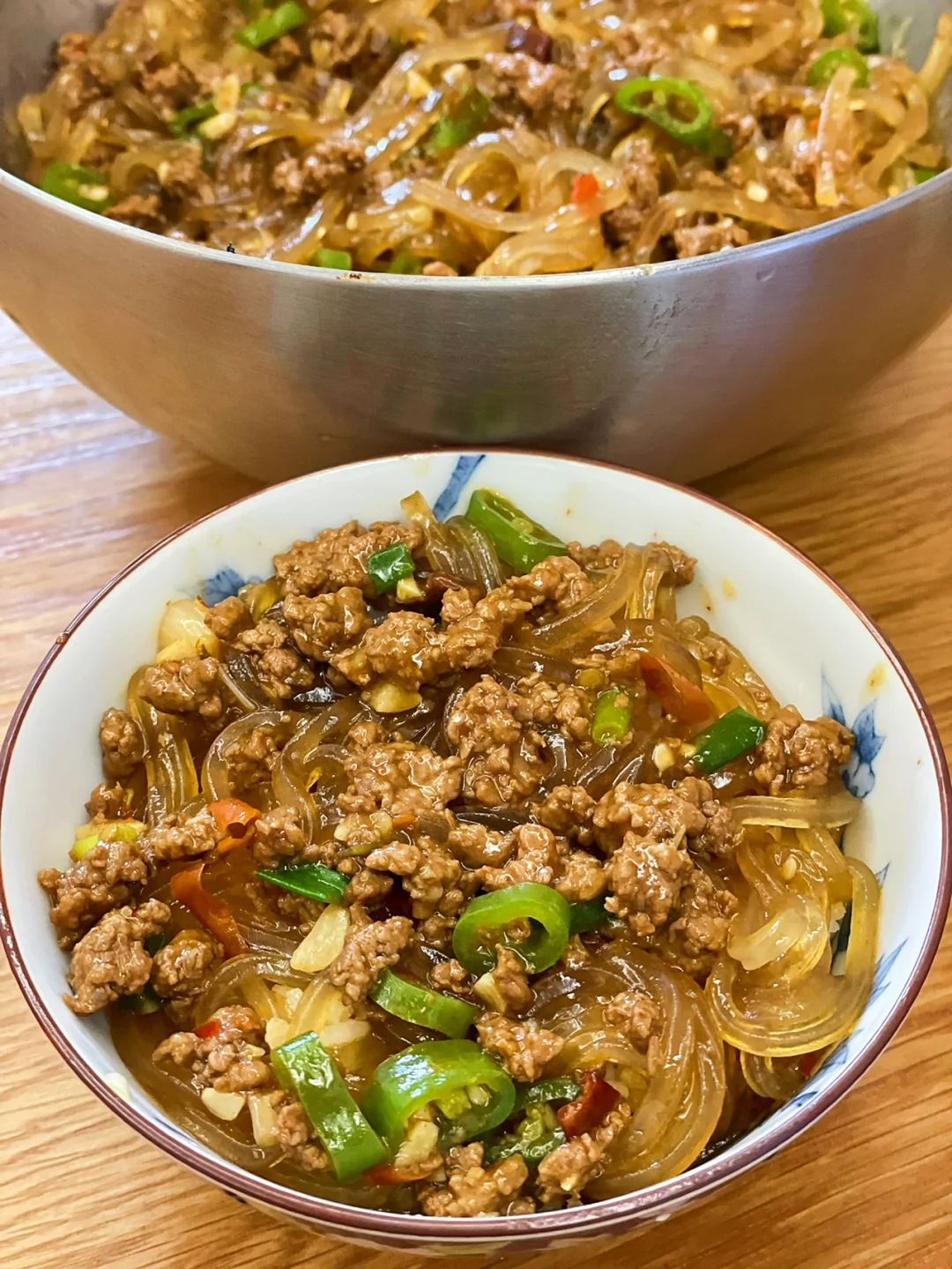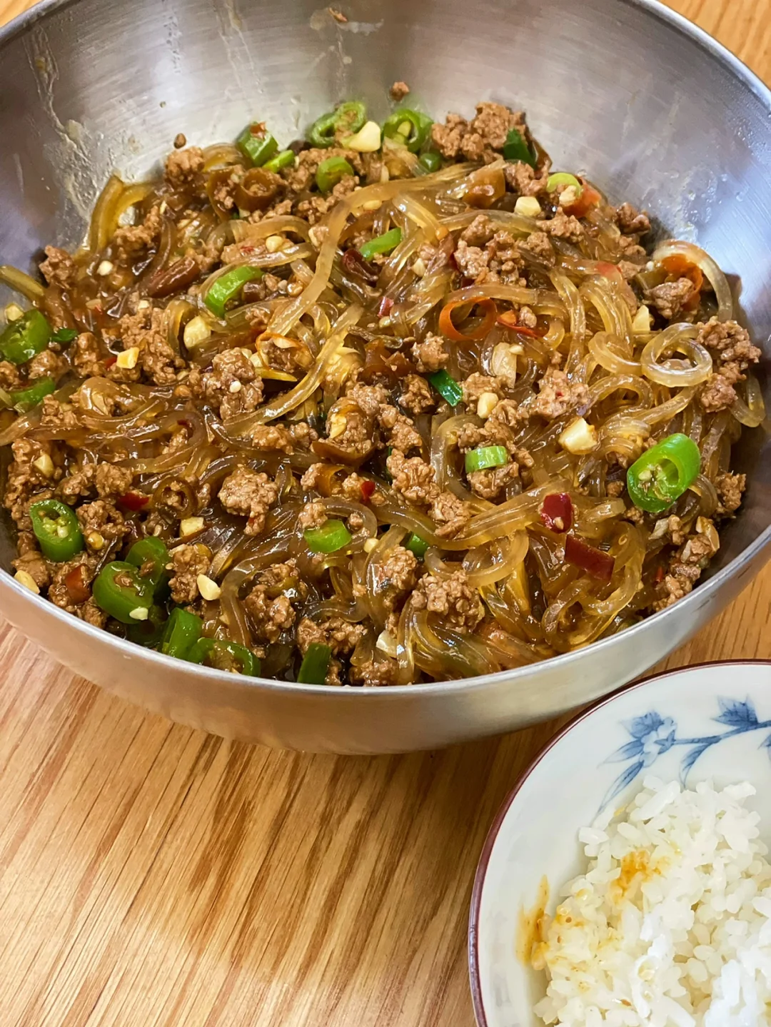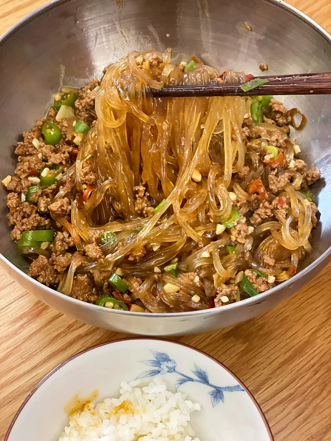 汁鲜入味的肉末粉丝煲,浓郁的汤汁包裹着粉丝,吸溜吸溜一大盘,强烈推荐‼️做法超简单还巨下饭🍚🍚🍚 🧾食材:牛肉,粉丝,泡椒,二荆条 👩🍳做法简单 1⃣️:牛肉洗净切末,大蒜切末,泡椒和二荆条切成小圈,粉丝提前泡软 2⃣️:油热下大蒜和泡椒炒香,倒入肉末快速翻炒,加一勺豆瓣酱炒出红油,再加入一勺生抽,半勺老抽,一勺蚝油炒匀 3⃣️:加两碗清水煮开,下粉丝拌匀,下二荆条,加一勺盐和一勺鸡精调味,煮至汤汁浓稠,撒葱花出锅