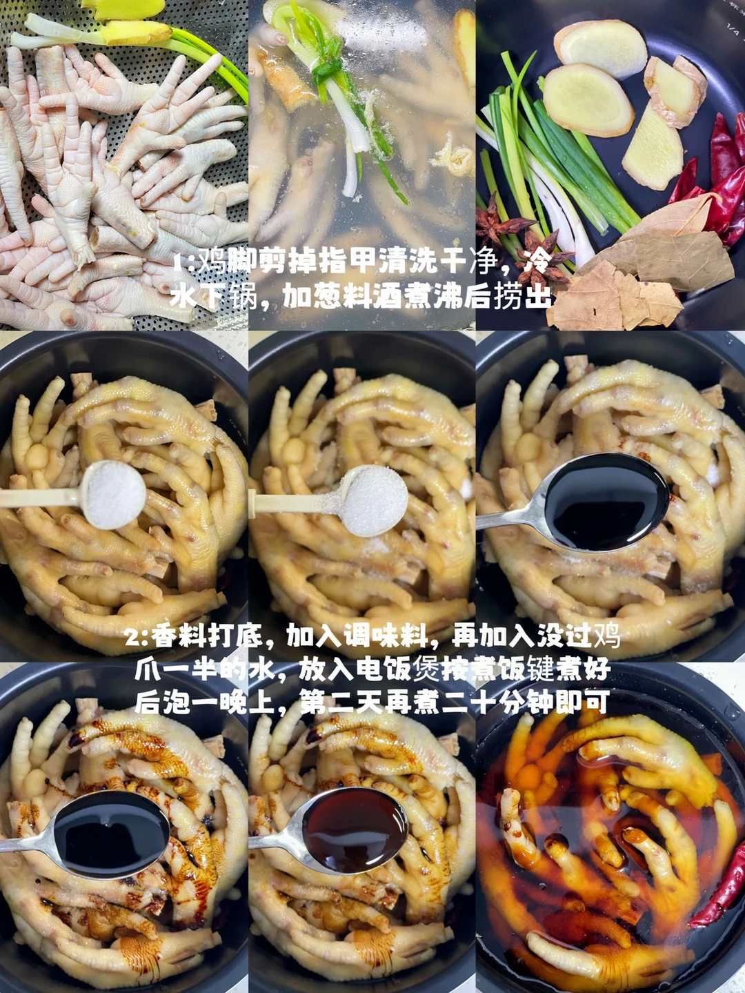 3⃣️:挨个铺入鸡脚,加入三勺生抽,三勺老抽,两勺蚝油,一勺盐,一勺白糖,加入一碗水(水要没过食材一半的位置)按煮饭键煮好