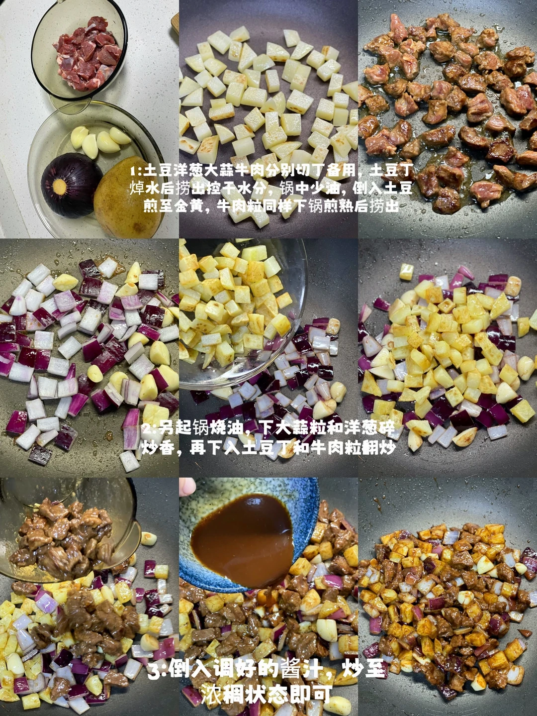 4⃣️:锅中留底油下洋葱碎和大蒜炒香,再分别倒入土豆丁和牛肉粒翻炒,最后倒入提前调好的酱汁炒至浓稠就好