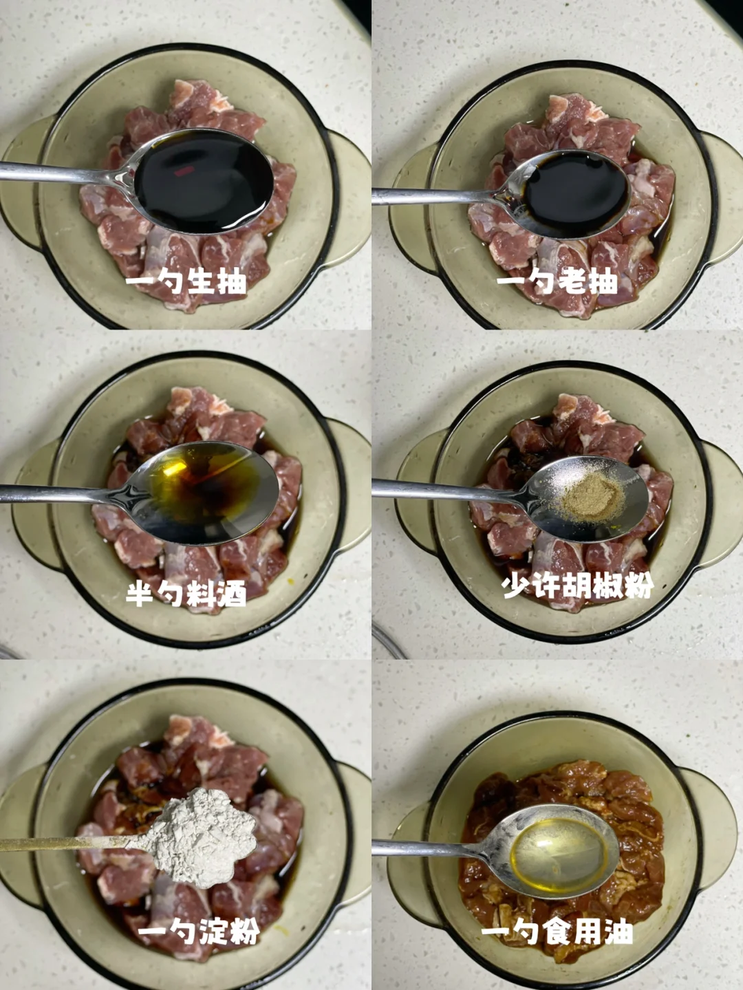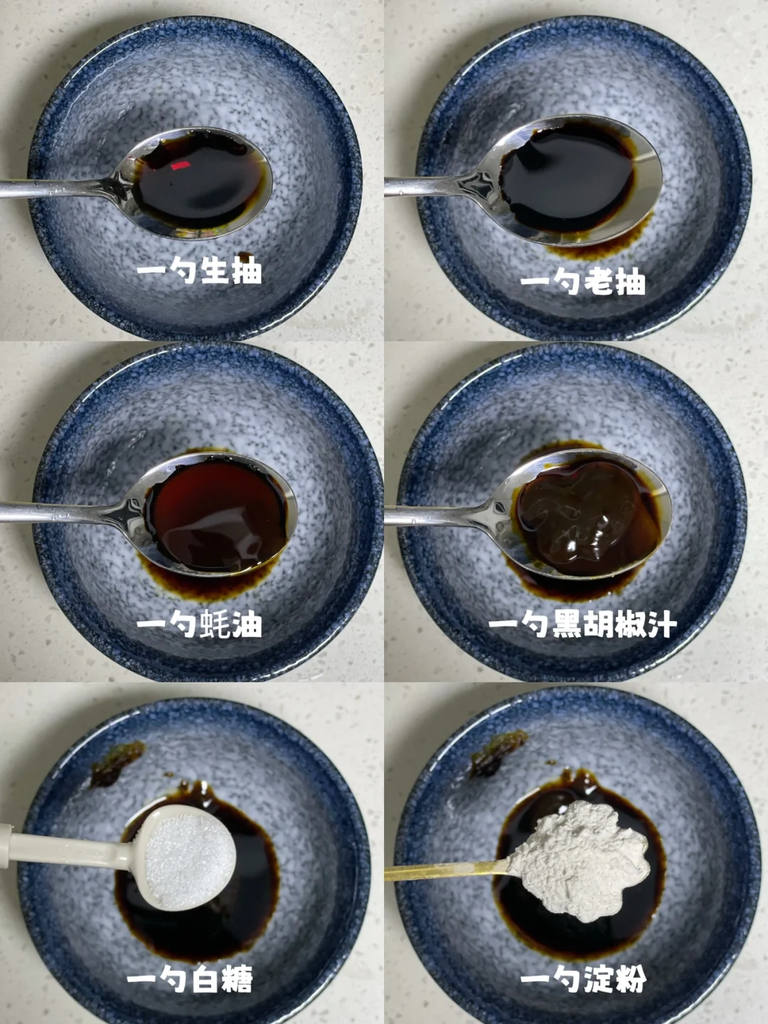 2⃣️:碗中加入一勺生抽,一勺老抽,一勺蚝油,一勺黑胡椒汁,一勺淀粉,一勺白糖,三勺水搅匀