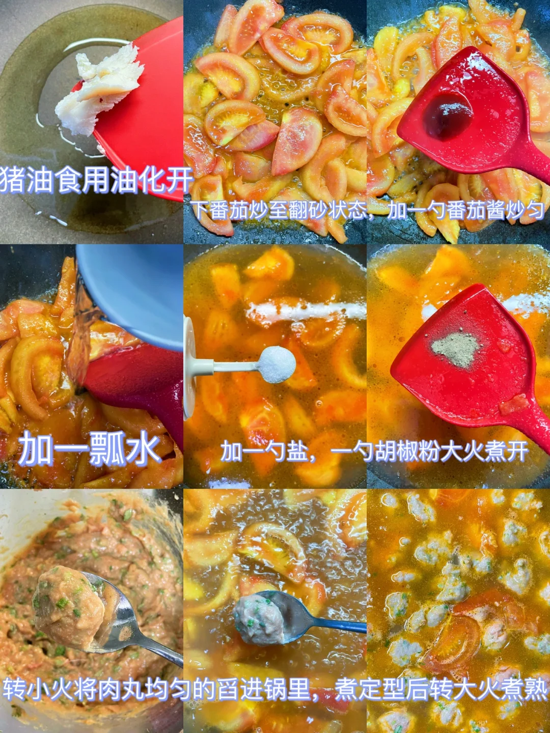 2⃣️:锅中加入食用油和猪油化开烧热,倒入番茄炒出砂,加入一勺番茄酱炒匀,再加入一瓢水,加一大勺盐和适量一勺胡椒粉大火烧开,转小火,依次均匀的舀入肉丸,肉丸煮定型后转大火,待肉丸全部漂浮起来出锅,撒上葱花即可
