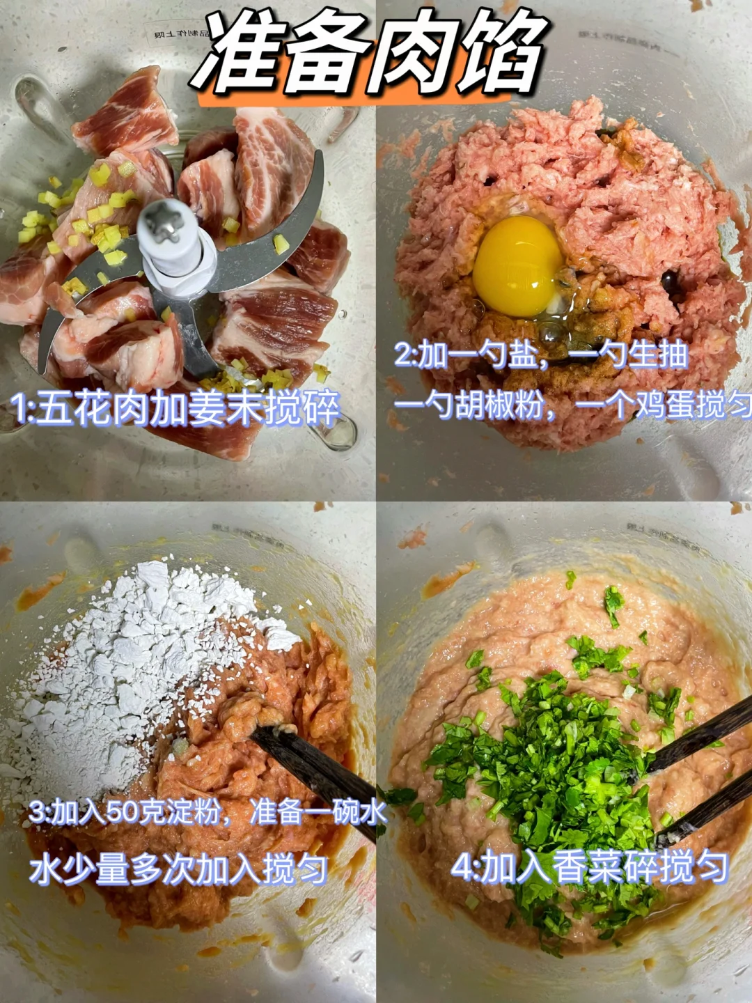 1⃣️:梅花肉切小块加一点姜末放绞肉机绞碎,加入一大勺盐,一大勺生抽,一勺胡椒粉,一个鸡蛋搅匀,再倒入50克淀粉,准备一碗清水,少量多次浇入搅匀,最后放入香菜碎搅匀