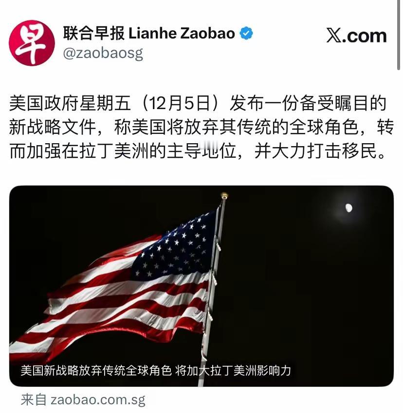 联合早报报道:“美国政府12月5日发布一份备受瞩目的新战略文件,称美国将放弃其传统的全球角色,转而加强在拉丁美洲的主导地位,并大力打击移民。” 放弃美国的全球的传统角色?不。这不是美国想要的,这是特朗普想要的,而且还是他的权宜之计。如果民主党重新上台,一切都会发生变化。 加强在拉丁美洲的主导地位?拉丁美洲有可以威胁美国国家安全的国家存在吗?没有。所以不用任何加强美国在拉丁美洲也是主导地位。 为打击移民放弃全球角色?更是荒谬。 特朗普之所以放弃全球角色就是因为美国在无力解决乌克兰问题后又将面临日本这个它也无法解决的问题,他签署新的战略文件为对是避免美国或他自己卷入其中而在事先做的躲避准备而已。特朗普,挺狡猾。