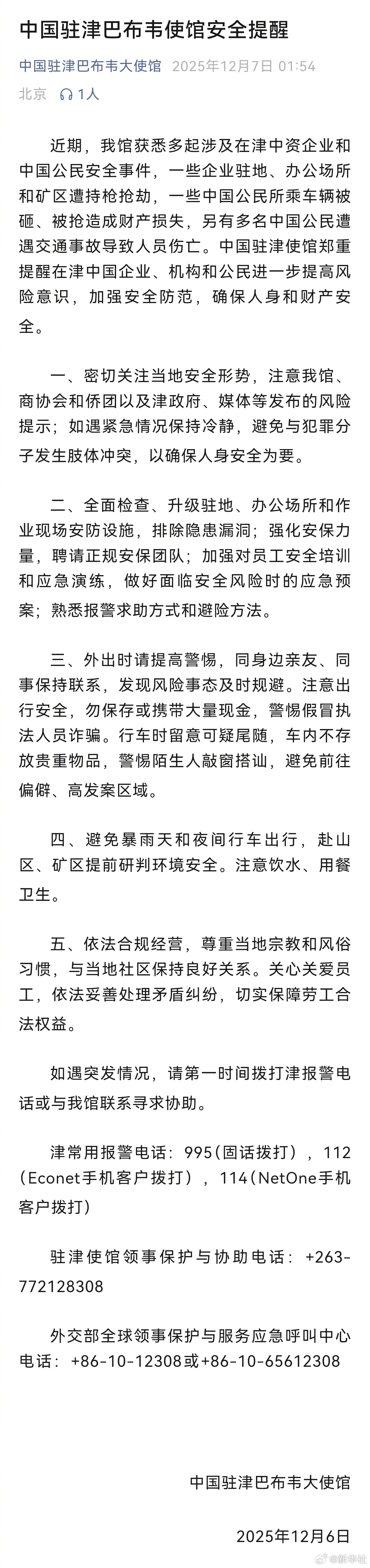 【#中国驻津巴布韦使馆发布安全提醒#】#我使馆提醒在津企业机构和公民加强防范#近期,我馆获悉多起涉及在津中资企业和中国公民安全事件,一些企业驻地、办公场所和矿区遭持枪抢劫,一些中国公民所乘车辆被砸、被抢造成财产损失,另有多名中国公民遭遇交通事故导致人员伤亡。中国驻津使馆郑重提醒在津中国企业、机构和公民进一步提高风险意识,加强安全防范,确保人身和财产安全。一、密切关注当地安全形势,注意我馆、商协会和侨团以及津政府、媒体等发布的风险提示;如遇紧急情况保持冷静,避免与犯罪分子发生肢体冲突,以确保人身安全为要。二、全面检查、升级驻地、办公场所和作业现场安防设施,排除隐患漏洞;强化安保力量,聘请正规安保团队;加强对员工安全培训和应急演练,做好面临安全风险时的应急预案;熟悉报警求助方式和避险方法。三、外出时请提高警惕,同身边亲友、同事保持联系,发现风险事态及时规避。注意出行安全,勿保存或携带大量现金,警惕假冒执法人员诈骗。行车时留意可疑尾随,车内不存放贵重物品,警惕陌生人敲窗搭讪,避免前往偏僻、高发案区域。四、避免暴雨天和夜间行车出行,赴山区、矿区提前研判环境安全。注意饮水、用餐卫生。五、依法合规经营,尊重当地宗教和风俗习惯,与当地社区保持良好关系。关心关爱员工,依法妥善处理矛盾纠纷,切实保障劳工合法权益。如遇突发情况,请第一时间拨打津报警电话或与我馆联系寻求协助。津常用报警电话:995(固话拨打),112(Econet手机客户拨打),114(NetOne手机客户拨打)驻津使馆领事保护与协助电话:+263-772128308外交部全球领事保护与服务应急呼叫中心电话:+86-10-12308或+86-10-65612308(中国驻津巴布韦大使馆微信公号)