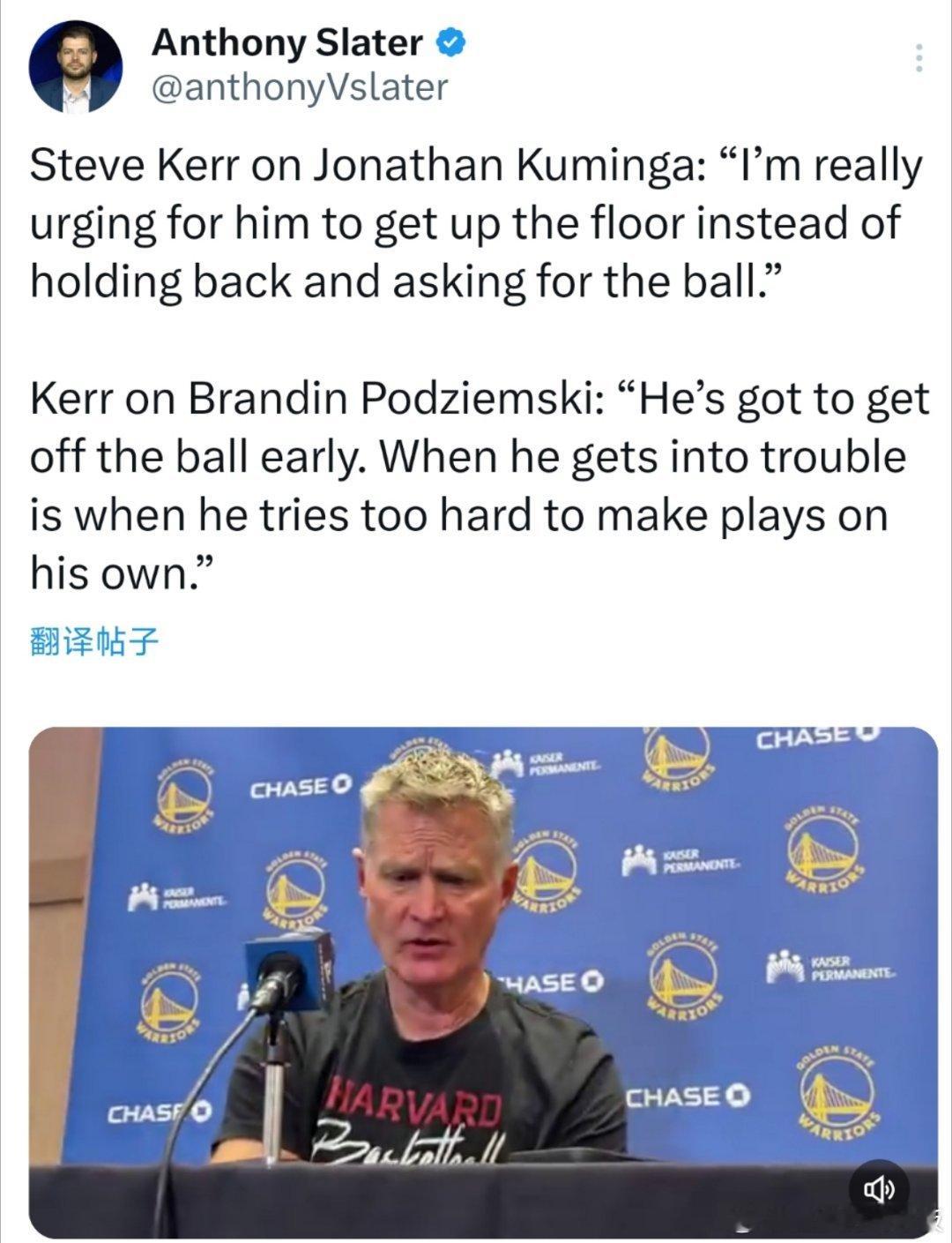 科尔在今日赛前采访中,提到了库明加和波杰姆斯基的一些问题🤔“对于库明加来说,我希望他积极跑动、保护好球,减少不必要的失误。另外,他需要加快进攻节奏,别总在后场要球,我希望他成为最先冲到前场的人,而不是最后一个。”“波杰必须早点出球,他陷入困境的原因,往往是他太想要依靠个人能力创造机会了。”勇士vs骑士