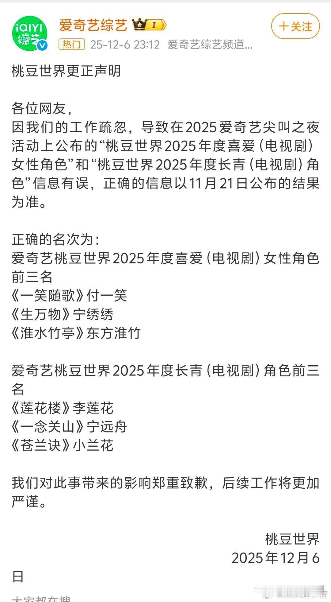 爱奇艺道歉爱奇艺道歉!这么重要的颁奖环节,粉丝 投的票,居然把两个人的奖搞错了,