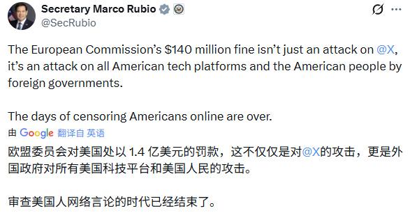 欧盟又悄悄咪咪地干大事情,让人出乎意料:2025年12月5日,欧盟委员会依据《数字服务法案》对马斯克旗下的社交媒体平台X作出首份“不合规决定”,处以1.2亿欧元罚款,这也是该法案生效后的首张罚单,核心审查聚焦于透明度违规问题。如果这1.2亿欧元最终用来购买美国武器以支援乌克兰,那可以理解为“取自于美国、用之于美国”,实现了完美闭环。但这个完美闭环让美国人很不爽,所以鲁比奥随后发表了措辞严厉的警告:欧盟委员会对美国(注意:这里已经上升到国家行为了)处以1.4亿美元的罚款,这不仅仅是对X的攻击,更是外国政府对所有美国科技平台和美国人民的攻击。审查美国人网络言论的时代已经结束了。