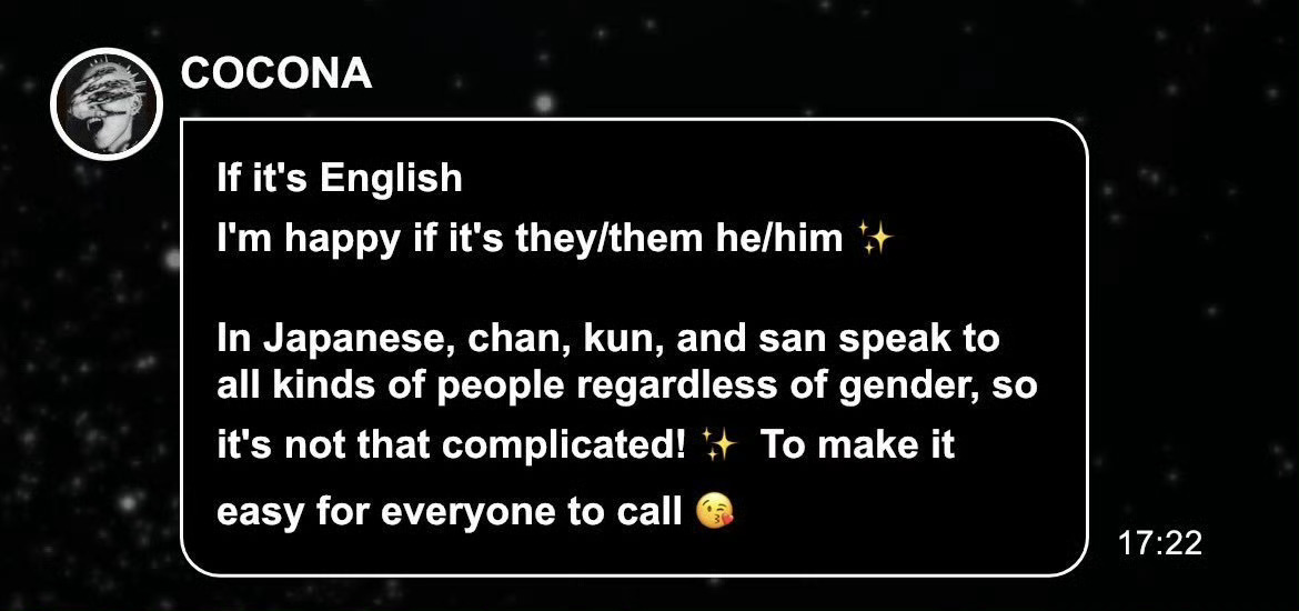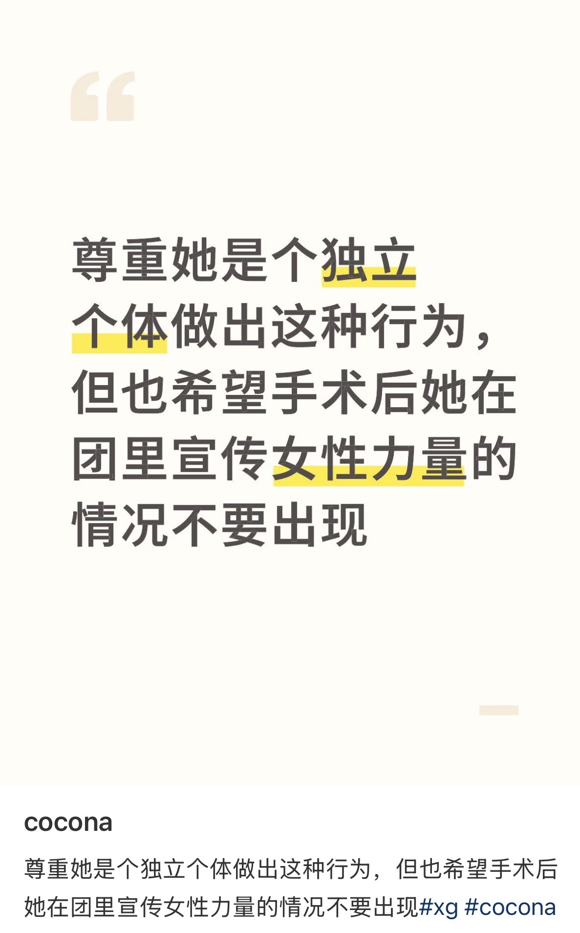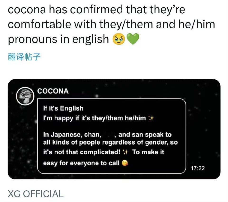 XG Cocona在回答关于用什么代词称呼自己时说:如果是英文用they/them、he/him我会很开心 要不哥哥你还是退出女团吧…xg女团成员宣布胸部切除术