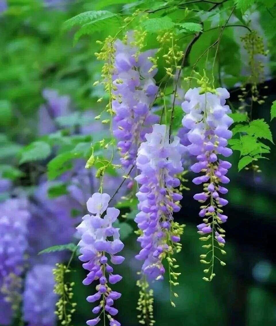 紫藤挂云木 春日的紫藤花垂落如紫色云霞,一串串花穗从藤蔓间垂下,似风铃轻摇。花