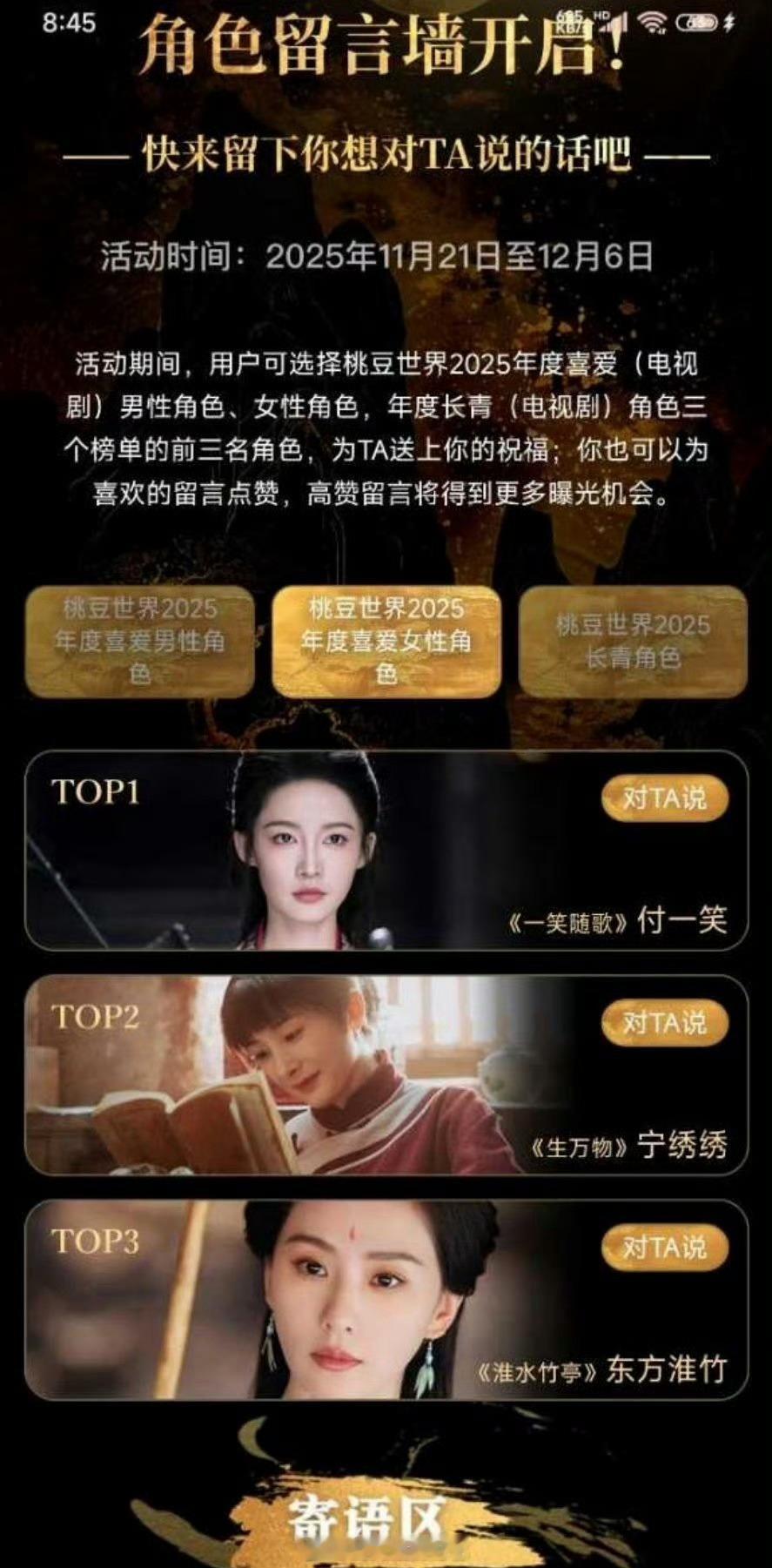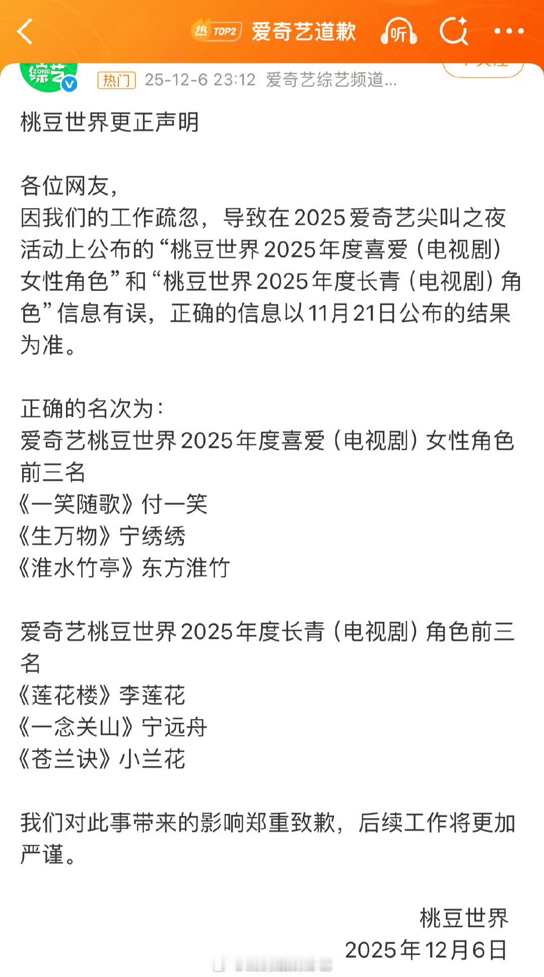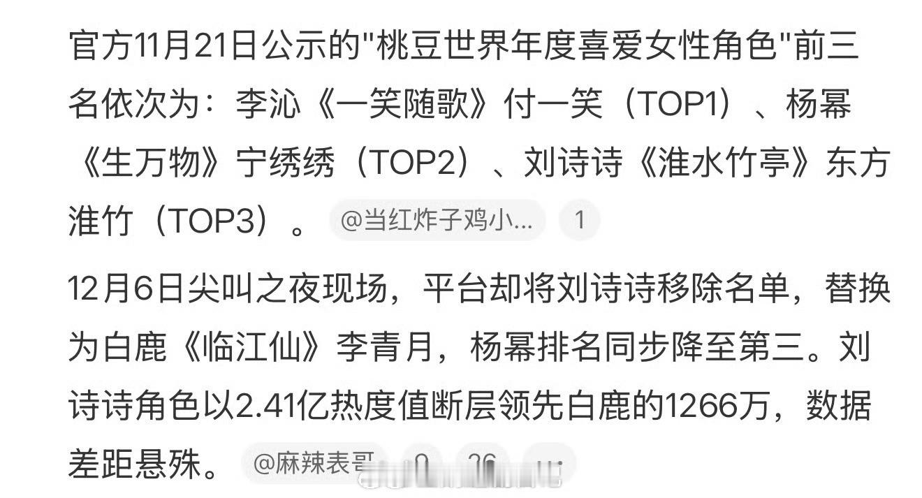 爱奇艺这次的奖项事件好离谱,投票的时候最喜爱的女性角色是:1.李沁《一笑随歌》付一笑、2.杨幂《生万物》宁绣绣、3.刘诗诗《淮水竹亭》东方淮竹。颁奖的时候刘诗诗的奖项没有了,白鹿《临江仙》李青月排名第二了。难怪几家粉丝要维权了。不去就要被这么对待吗?刘诗诗无妄之灾了。爱奇艺颁奖失误