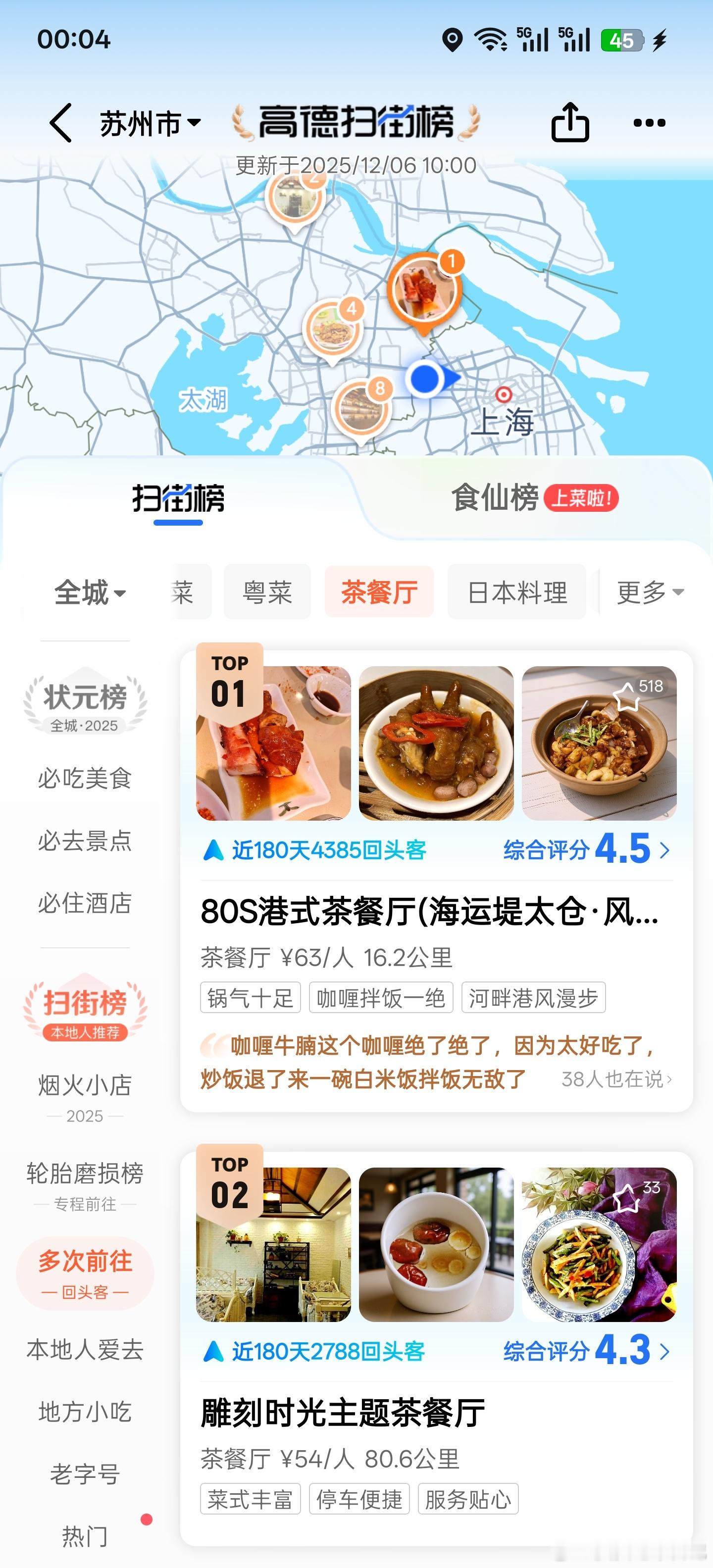 如果各位对港式大排档感兴趣,且刚好路过江苏太仓的话,真心建议去一趟这个「 80S 港式茶餐厅」,出品正宗,且一吃你就知道,这绝不是预制菜(跟现在很多招摇撞骗,毁坏我们广东早茶/茶餐厅口碑的圈钱门店不可相提并论),本广东人为这个评价负责!图❶星洲炒米粉图❷韭菜猪红(猪红就是猪血)图❸黄油菠萝包图❹咖喱鱼丸图❺餐厅的墙上,是关于「香港为何别名是香江」的由来解释图❻则是高德扫街榜为这家店实力背书(事实也确实如此,我晚上 7 点多到的,排队排了 20 分钟)补充一个小细节:图二的那个韭菜猪红,我我第一口下嘴,就知道这个胡椒的味道给淡了,但考虑到这里是苏州,估计为了照顾大众口味,所以做了本土化的改良,就没说啥,等到结账时,跟服务员提了一嘴,他们直接给我说道:消费者对味道不满意,可以当场重做的,随后因为我已经吃完了,他们说给我说了一张柠檬茶的抵扣劵,下次来可以用,怎么说呢,至少服务态度很让人满意,情绪价值也到位了,我后面有时间肯定还会再去的