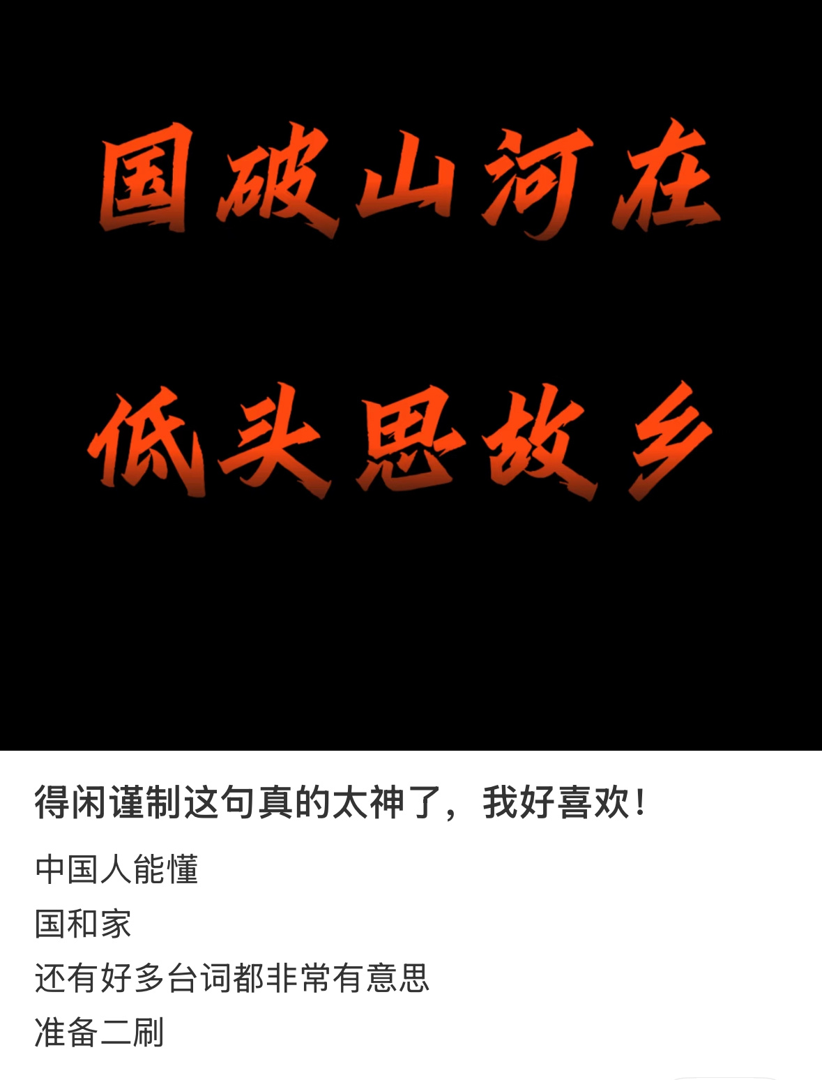 现在满脑子都是这两句,国破山河在,低头思故乡。一句讲国,一句讲家。是杜甫的现实主义与李白的浪漫主义结合在一起,大唐盛世两座高峰绵延在一处,文化的根不断,文脉不断,文明不断,精神便万世永存。得闲谨制里全都是金句,没有一句废话实在太牛了