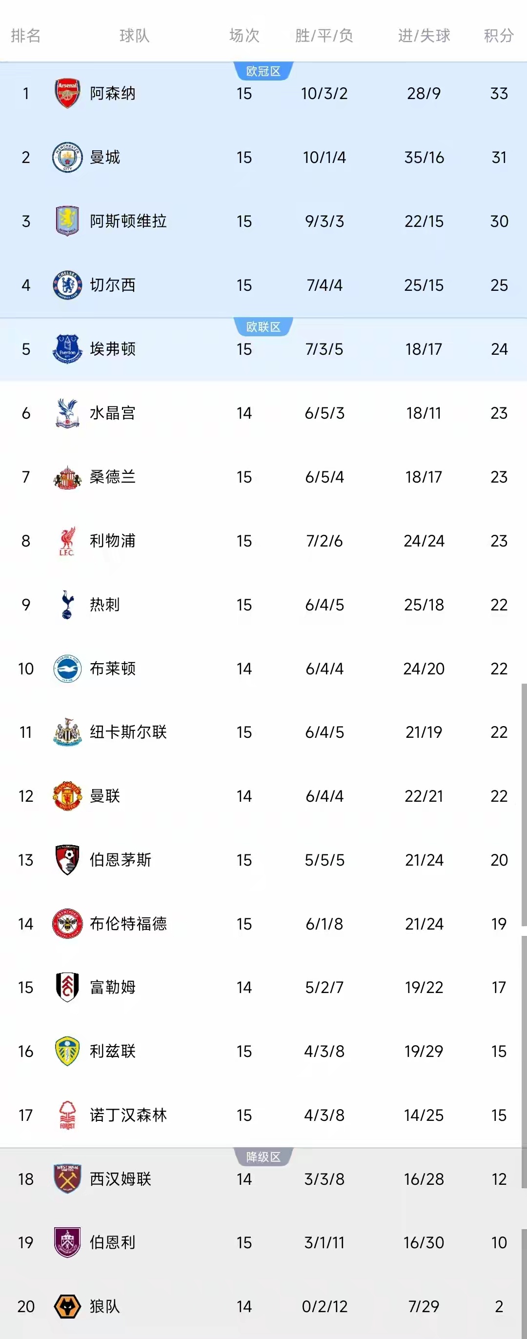 英超积分榜大洗牌!阿森纳领跑优势缩水 曼城紧追3队争冠英超最新积分榜 12月7日,英超第15轮多场焦点战落幕,积分榜格局迎来剧烈重塑。阿森纳客场1-2遭阿斯顿维拉读秒绝杀,18场不败纪录终结,仍以33分领跑,但领先优势缩水至2分。曼城主场3-0完胜桑德兰豪取3连胜,积28分升至次席,紧咬榜首;维拉凭借绝杀跻身前三,积27分成为争冠搅局者。利物浦3-3遭保级队利兹联补时绝平,14轮仅积22分排名第9,与争冠集团差距拉大至10分。保级区方面,狼队14轮未尝一胜仅积2分垫底,保级形势岌岌可危。