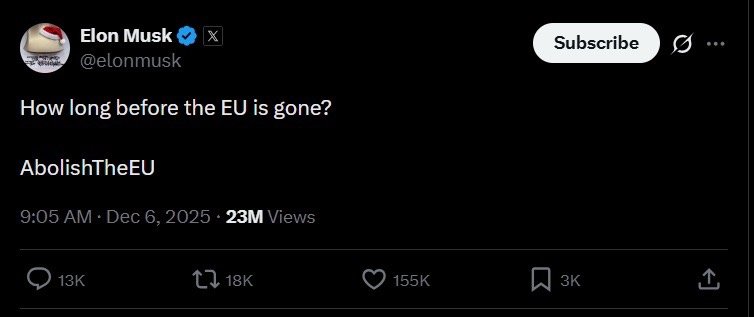 欧盟对马斯克旗下企业开巨额罚单欧盟开罚单的理由简单:认证误导、广告不透明、数据不开放。其实是在说:“你的产品、算法、舆论能力不能再由你一个人定义了。”结果马斯克没忍住,直接回怼呼吁“废除欧盟”。 马斯克欧盟