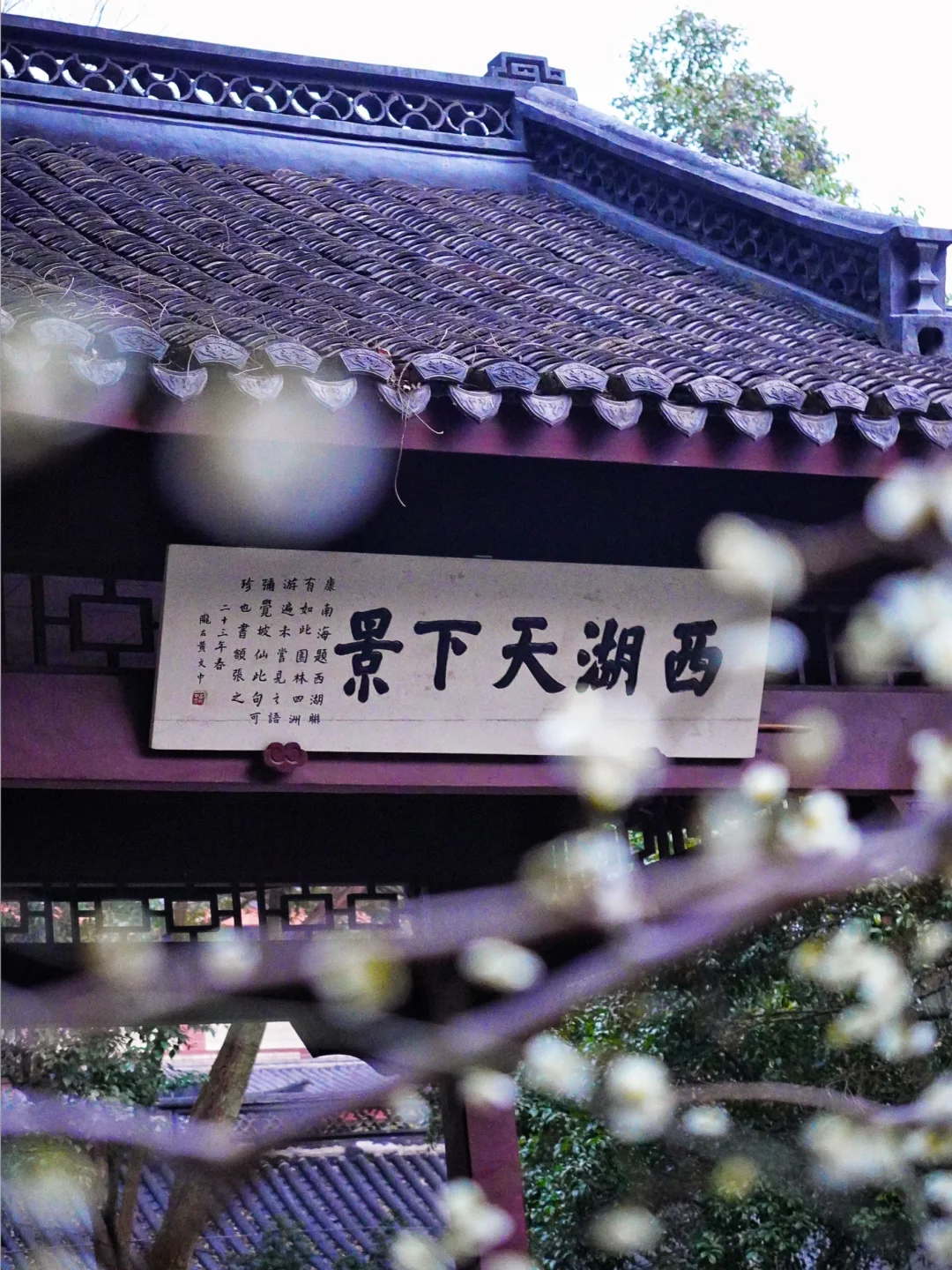 这里是孤山梅花最密集的地方,有红梅、白梅、绿萼梅,黛瓦飞檐与梅花相映成趣,非常适合穿汉服撑油纸伞拍照,分分钟拍出《梦华录》同款宋韵。