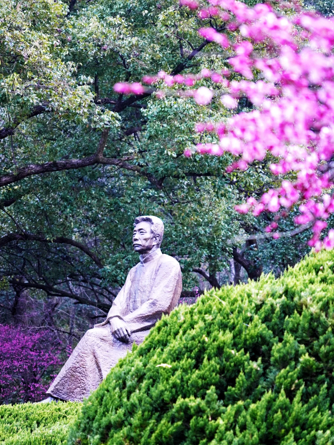 鲁迅铜像旁的梅枝低垂,可以以梅花为前景,仰拍铜像,构图绝美!