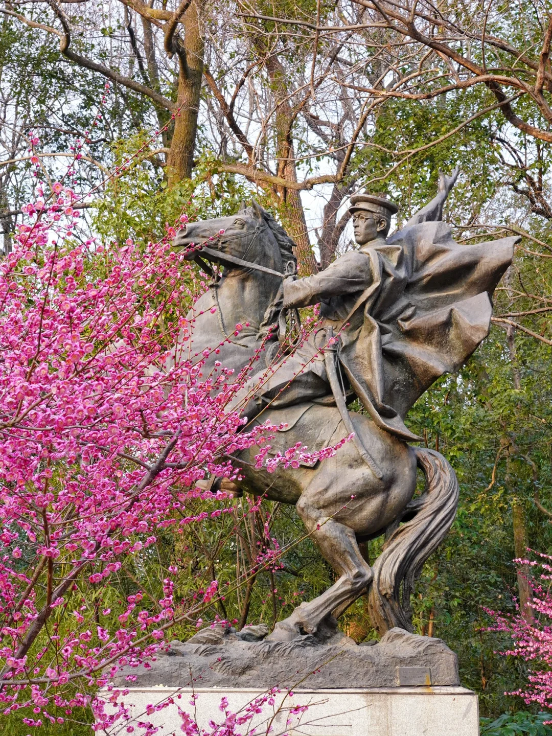 这里有红梅和白梅,形态清雅,可以拍到革命先驱陈其美雕像和梅花的同框。