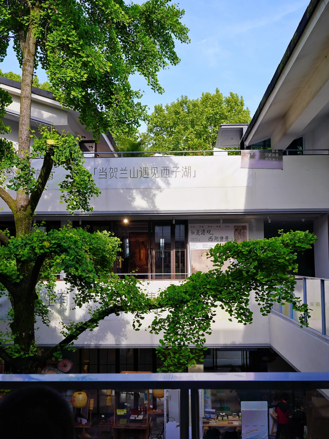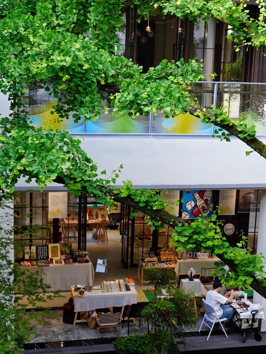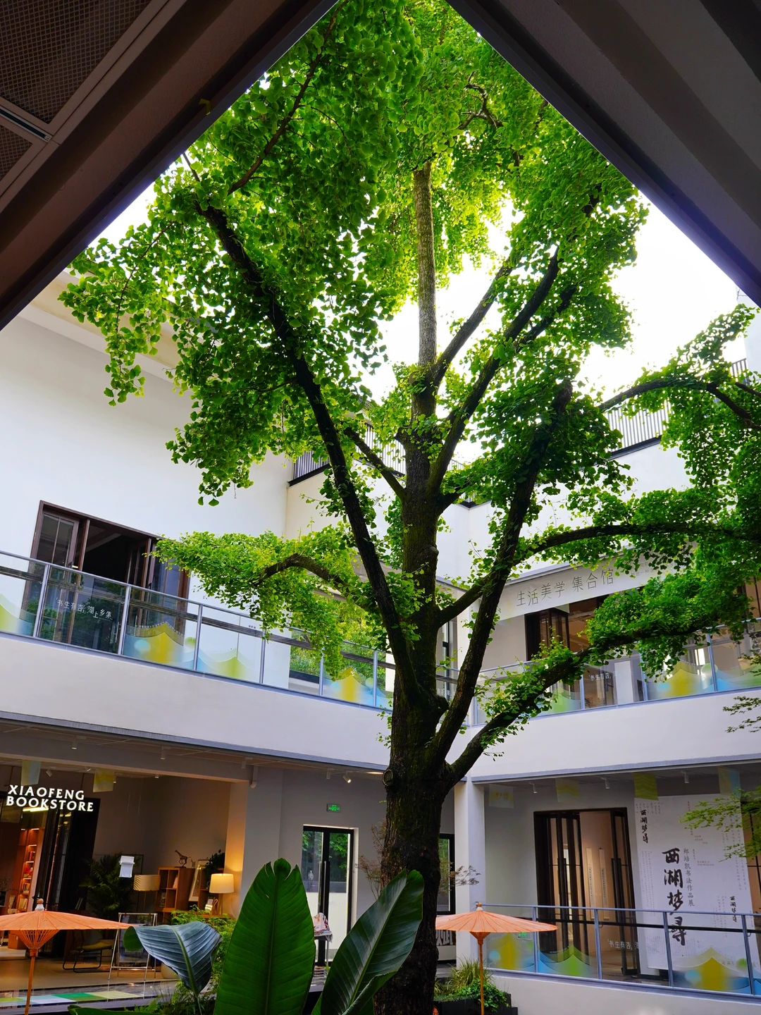 整个空间有3层楼,集合了书店、文创、咖啡、酒、市集和展览。建筑中间有一棵高大的百年银杏树🌳,每一层都被绿意环绕🍃,阳光☀️透过枝叶,光影照在白墙上,一整个春夏氛围感拉满!可以坐在树下喝咖啡☕️,看书📖,安静地待一下午。