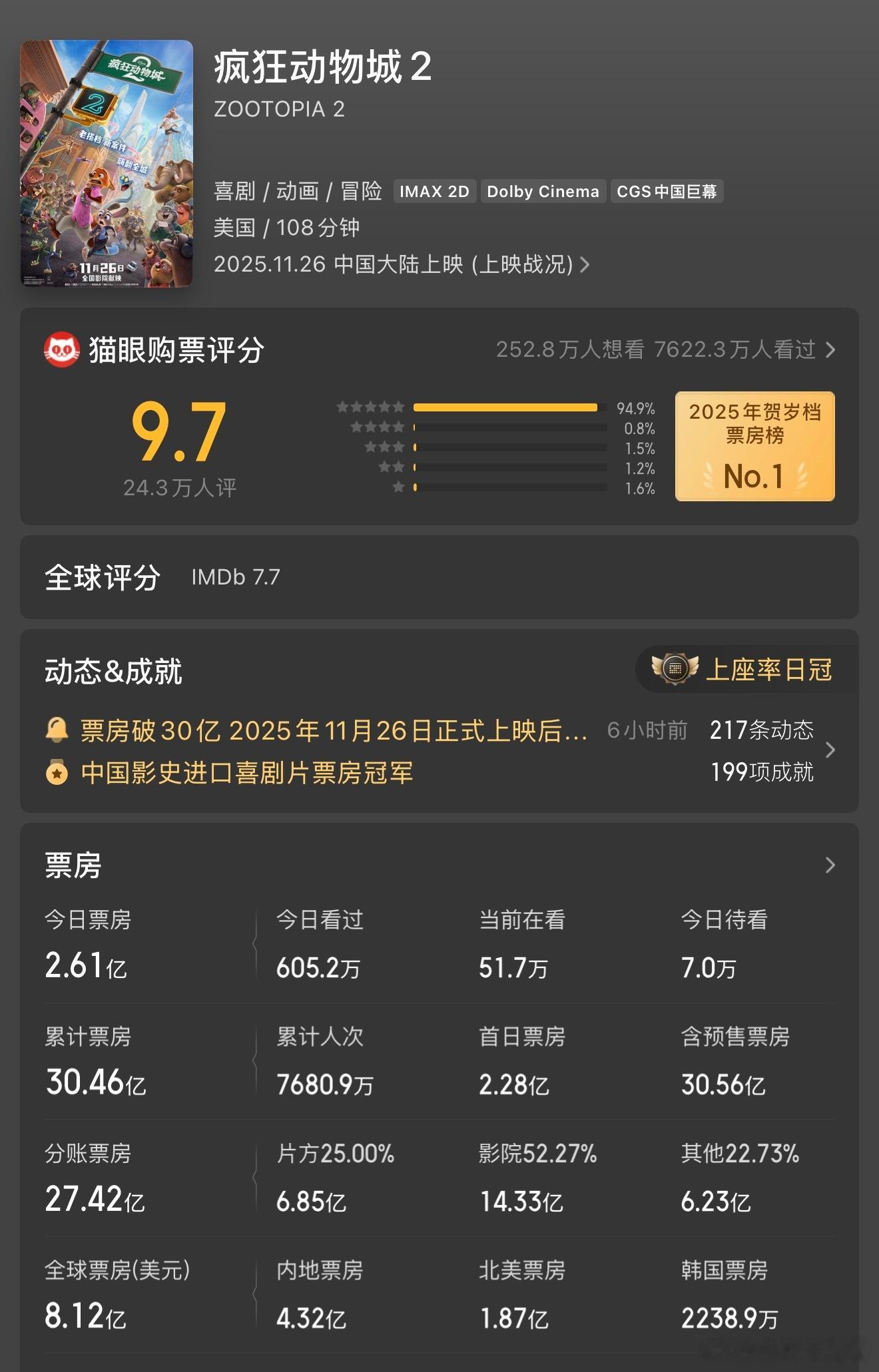 刚看完《疯狂动物城2》,讲道理还蛮不错,属于是老少皆宜的片子,刚看全球票房都破30亿了,建议你们要看就看英文原版,有没有已经看了的盆友