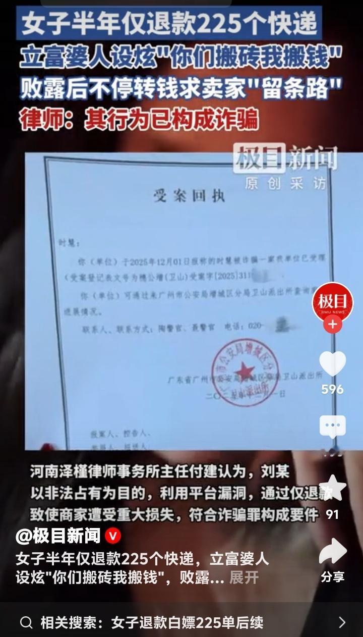 朋友圈晒豪车三套房子的“富婆”翻车记:半年225个诈骗订单背后的贪婪与人性黑洞,山东烟台刘女士的“精致”骗局终遭全网唾弃 当你在朋友圈刷到那些豪车、豪宅和成堆现金的照片时,是否会心生羡慕?山东烟台的刘女士就是这样一位“人生赢家”,她的社交账号充斥着奢华气息,三套房产和名牌座驾仿佛在无声宣告着她的成功。然而,光鲜亮丽的背后却隐藏着令人震惊的真相——这位“富婆”的财富,竟是通过半年内对同一家网店下单225次、精心策划诈骗得来的。如今,她不仅面临商家起诉,更被警方立案调查,一场由贪婪编织的幻梦彻底破碎。 根据广州电商老板时女士提供的证据,刘女士的操作堪称“产业级”欺诈。她专门瞄准平台规则漏洞,每次同时下单贵价商品和便宜货,在快递途中申请贵价商品“仅退款”触发物流拦截,实则调包后退回低价物品,将高价商品私吞。这套“狸猫换太子”的手法被她重复了225次,累计骗取超过五万元财物,而骗来的商品甚至被她用小号在二手平台低价转卖。 更讽刺的是,在诈骗行径曝光前,刘女士一直维持着“独立女性”人设,在粉丝群和朋友圈高调炫富,晒出豪车、房产和存款截图,言语间尽显优越感。这种刻意营造的虚假形象,与她的所作所为形成鲜明对比,仿佛一场精心导演的双面人生。直到商家收集证据报警,她才慌忙转变态度,一边转账求和解,一边诉苦称自己是单亲妈妈、生活不易,企图用悲情牌掩盖恶意欺诈的事实。 然而,商家时女士选择了硬刚到底。她拒绝和解,坚持追究法律责任,因为这不是普通的消费纠纷,而是有预谋的诈骗犯罪。警方受理案件后,刘女士面临的将是法律严惩。律师指出,她的行为已符合诈骗罪构成要件,金额累计较大,可能面临三年以上有期徒刑。这场闹剧警示所有人:网络并非法外之地,任何利用规则漏洞牟利的行为,终将付出代价。 从更深层看,刘女士案件折射出电商生态中的隐痛。“仅退款”等本意为保护消费者的规则,在缺乏有效监管时,竟成了少数人钻空子的工具。而快递拦截环节的漏洞,更是让“调包计”屡屡得逞。这不仅伤害了诚信经营的商家,也侵蚀着网络交易的信任基石。当骗术被包装成“致富经”,当贪婪披上“精致生活”的外衣,我们更应警惕这种扭曲的价值观对社会的腐蚀。 刘女士的“炫富”面具被撕下后,留下的只剩全网嘲讽与深思。真正的高贵从来不是豪车豪宅堆砌的假象,而是内心坚守的底线与良知。此案也给所有平台和商家敲响警钟:完善规则、加强审核,才能不让善良的初衷被恶意践踏。而对于我们每个普通人而言,守住诚信、尊重他人的劳动,才是通往美好生活的唯一正途。 (来源:综合极目新闻、广州警方受案回执及电商商家时女士公开证据) 电商诈骗事件 人性的贪婪