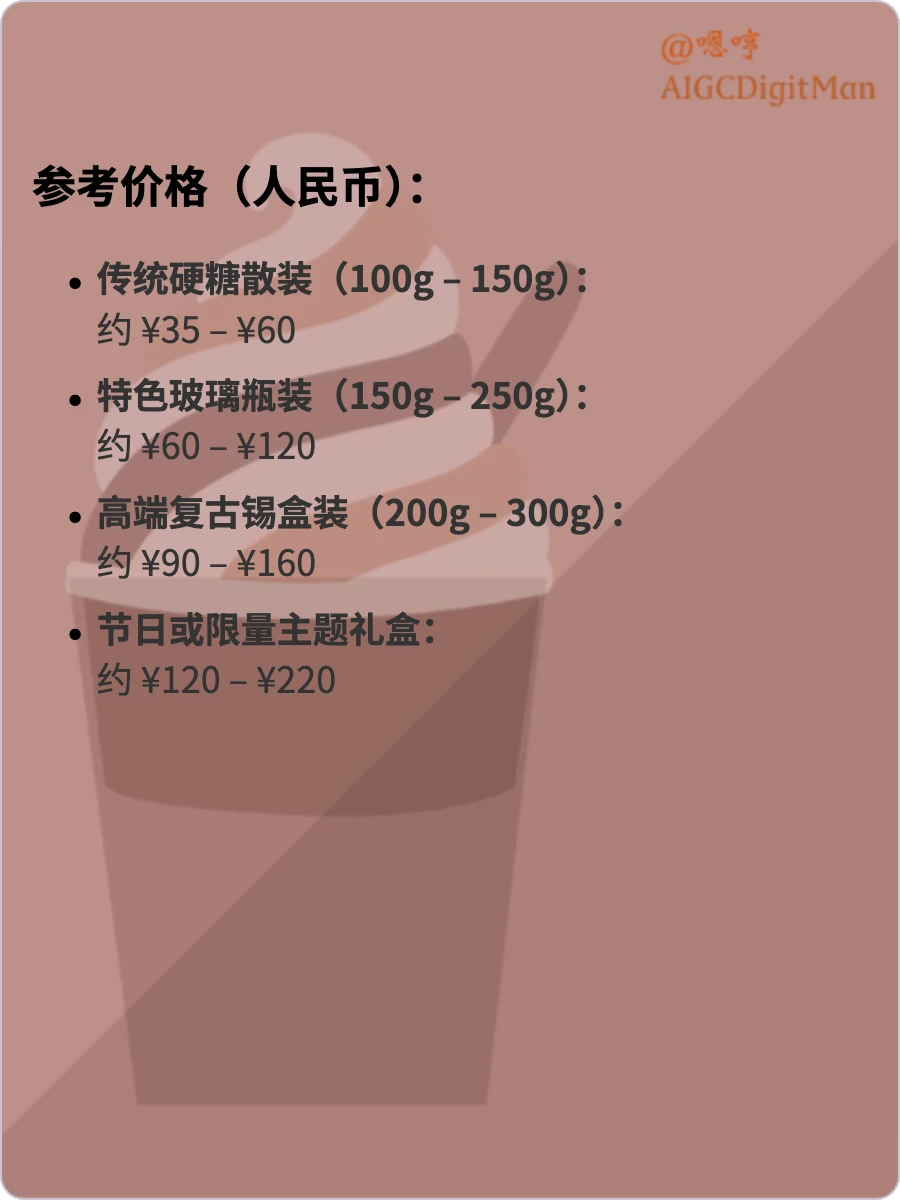 传统硬糖散装(100g – 150g): 约 ¥35 – ¥60