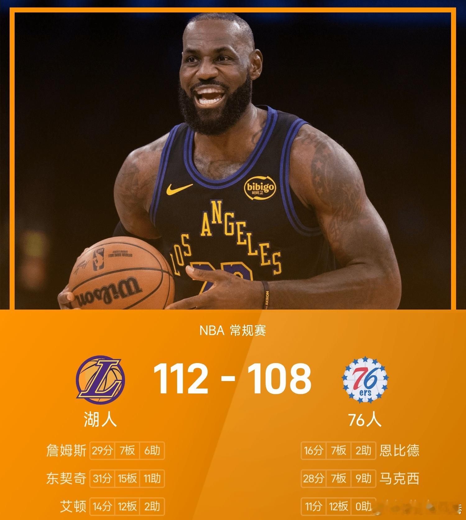 湖人战胜76人76人108-112不敌湖人。东契奇砍下全场最高的31分15板11助,率领湖人成功取胜。