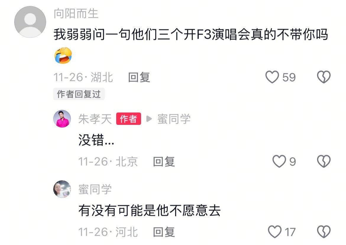 朱孝天回应缺席F4演唱会 之前朱孝天表示:艺人这个行业赚的没有你们想的那么多,我这种的也只不过是拿劳动报酬。赚钱比较多的,都是那些做生意的人,如果社会是一个金字塔的话,我顶多就是中间偏上一些,我离金字塔的塔尖还很远。那这回还错失一个大机会……