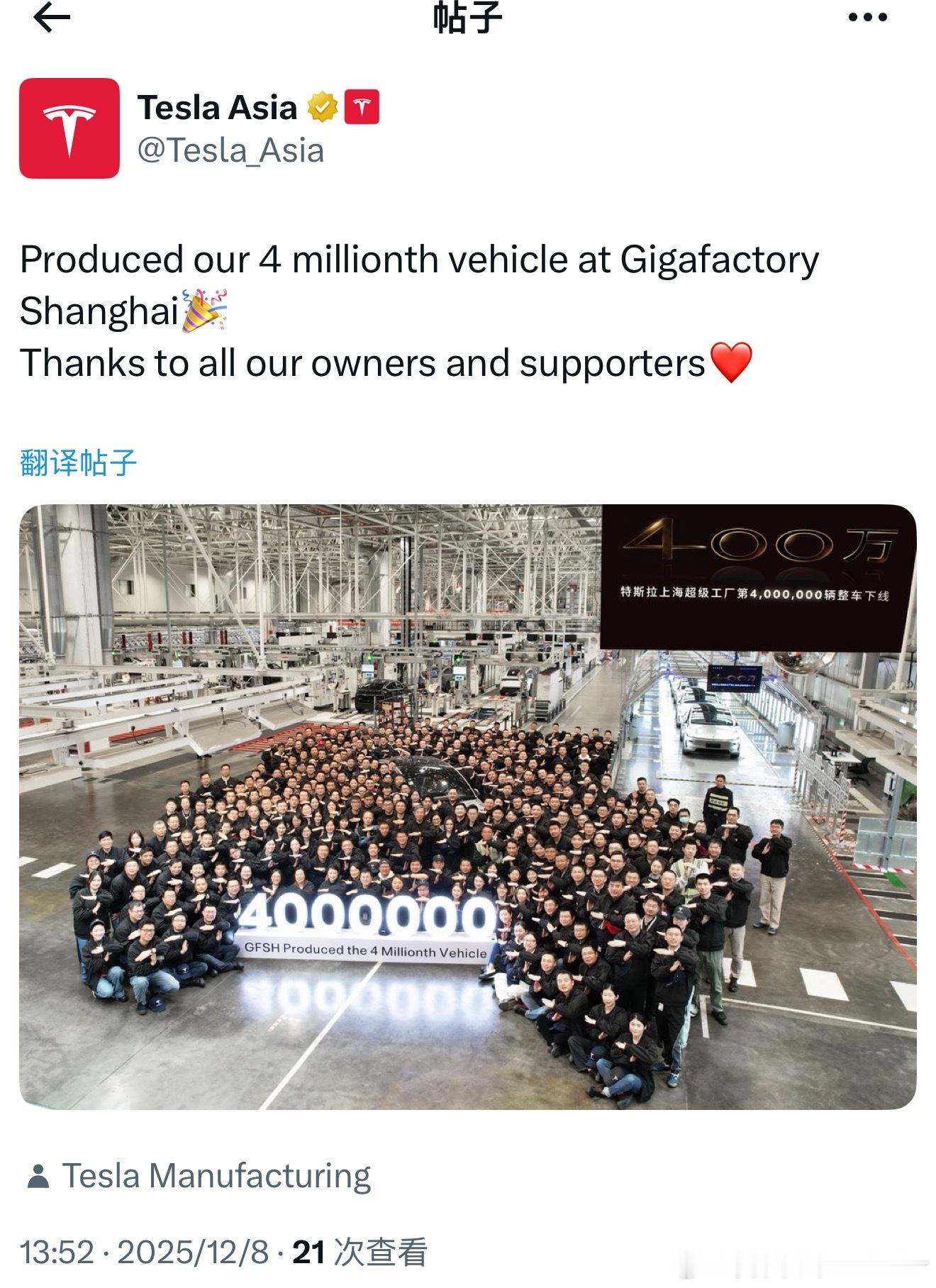特斯拉上海超级工厂第400万辆整车下线2025年12月8日特斯拉上海超级工厂第400万辆整车下线6年间,上海超级工厂贡献了特斯拉全球近一半的电动车交付量实现了高达95%+的本土化率平均30多秒下线一台整车从Model 3到Model Y再到第400万辆的主角🚗星光金 Model Y L每一款车都是中国智造的闪亮名片将来,特斯拉在中国还会给大家带来多少惊喜?🦾