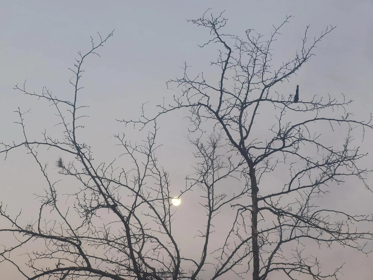 枝间月 暮色沉下来,月亮便嵌进枯瘦的枝桠间了。交错的枝干如墨线勾勒,将那一点清辉框成方寸温柔,连停在枝头的雀鸟,也静成了剪影。 风掠过枝梢,不见叶动,只听得细碎的风声,裹着冬日的清寒。月色从枝缝里漏下来,不耀眼,也不喧闹,只是淡淡铺在天地间,像揉碎的薄纱。 立在树下望久了,竟觉世间的纷扰都被这枝与月收了去。唯有这疏朗的树影,清浅的月色,还有枝头不语的雀,在暮色里,自成一方安然!