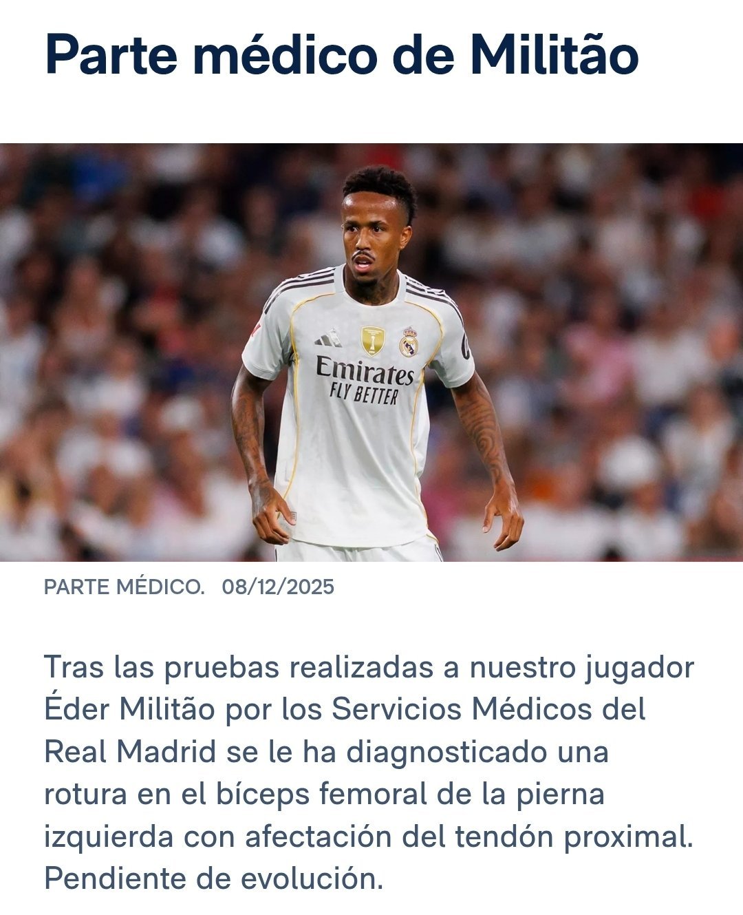 🚨官方:米利唐被诊断出左腿股二头肌撕裂,近端肌腱也受到影响!🚨Arancha Rodríguez:米利唐将缺席大约4个月。halamadrid