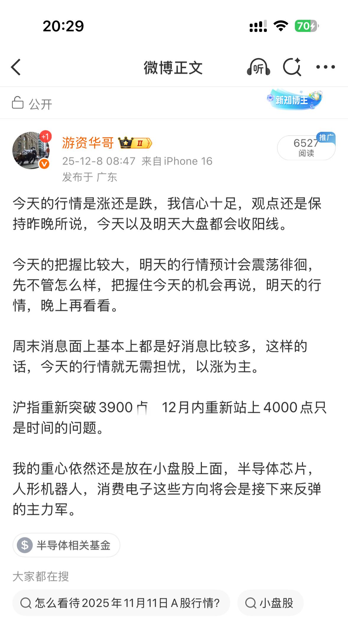 今天的预判又对了,那么明天呢?如果不出意外,明天的行情只有这么走了大家都知道华哥今天又又预判正确了,正确率依然还是那么高,很多人晚上可能都还在等着华哥明天的预判。今天早上的文章里面其实已经说到过,华哥认为周一跟周二都会收阳线。这个观点还是不改变,今天放量3000多亿,大涨3400多家。早上的时候已经说过今天会放量上涨,普涨,如今放量这么活跃,那么接下来就没有理由看空。怪不得福容科技会回落下来,拉萨帮进了,这个游资就是玩散户,明天有机会就跑,金发我们暂时持有,有什么会盘中通知福蓉科技 sh603327[股票]金发科技 sh600143[股票] 明天的行情,毫不犹豫,就是看红,再度收一根阳线。