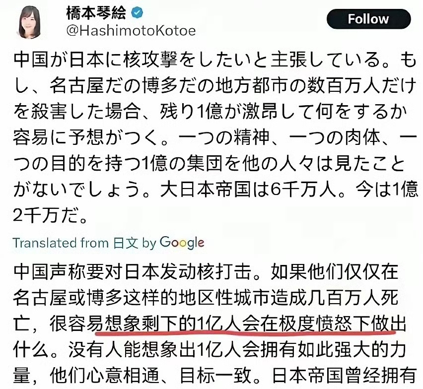 秦岭笑谈 【日本又想发动舆论战了日本极右翼女作家公然叫嚣:日本人不怕中国原子弹】中日动态近日,高市早苗的狂热支持者、日本极右翼女作家桥本琴绘公然叫嚣:如果他们仅仅在名古屋或博多这样的地区性城市造成几百万人死亡,很容易想象剩下的1亿人会在极度愤怒下做出什么。没有人能想象出1亿人会拥有如此强大的力量,他们心意相通、目标一致,一定会在极度愤怒下团结起来,向中国发起疯狂报仇……桥本琴绘的极端言论,反映了日本国内一股危险的右翼政治思潮正在抬头。这种错误言论极具煽动性且严重违背事实。这一事件并非孤立,而是日本当前社会政治氛围下的一个缩影。首先要说这货无脑无知,如果真的要灭倭寇,怎么会舍得只是在这些小城市,一定会让小日子亡国灭种,回到旧石器时代。说一个秘密,要消灭脚盆鸡 只需要在富士山口扔个蘑菇弹引爆火山爆发,再在马里亚纳海沟引爆氢弹让东京沉没,就会事半功倍一劳永逸解决所有问题,包括解决制造问题的所有人。日本右翼人士桥本琴绘近日在社交媒体声称,“若中方对日进行核打击,剩下的一亿多日本人会更加团结并进行报复”。这种言论恶意揣测,凭空污蔑中方威胁使用核武器。 煽动对立情绪,妄称日本人将“心意相通、目标一致”地发起复仇。 错误引用二战时期人口数据,暗示现代日本比“帝国时期”更强大。桥本琴绘被称为日本右翼“网红”,是高市早苗的狂热支持者,曾出版美化侵略历史的书籍,并鼓吹日本拥核。该言论与日本首相高市早苗上台后的一系列强军扩武、干涉中国内政(如台湾问题)的右倾化举动相呼应。日本首相高市早苗上台后,加速推进强军扩武,不仅计划提前实现防卫费占GDP2%的目标,还企图为修改“无核三原则”(即不拥有、不制造、不运进核武器)制造舆论。桥本琴绘作为其支持者,其言论与这一政治氛围相契合。此类言论的目的在于通过煽动对抗情绪和“受害者”叙事,为日本的军事松绑寻找借口。桥本琴绘本人曾出版《新大东亚战争肯定论》一书,公然美化日本侵略历史。尽管网上叫嚣,但现实情况是日本自卫队面临严重的“征兵难”问题。有国际民调显示,仅有9% 的日本人表示愿意为国家而战,这与右翼分子臆想中“一亿人团结复仇”的场景相去甚远。面对日本极右翼势力的无端猜测和肆意挑衅,必须厘清最基本的事实:中国是唯一公开承诺“不首先使用核武器” 的核武器国家,并承诺不对无核武器国家和无核武器区使用或威胁使用核武器。中国的核政策具有高度的稳定性和透明度,始终是维护全球战略稳定的积极力量。总结而言,桥本琴绘的言论是日本右翼势力为服务其国内政治议程而进行的极端舆论煽动,既不符合事实,也背离了日本国内众多渴望和平的声音以及国际社会的普遍期待。美防长警告日本