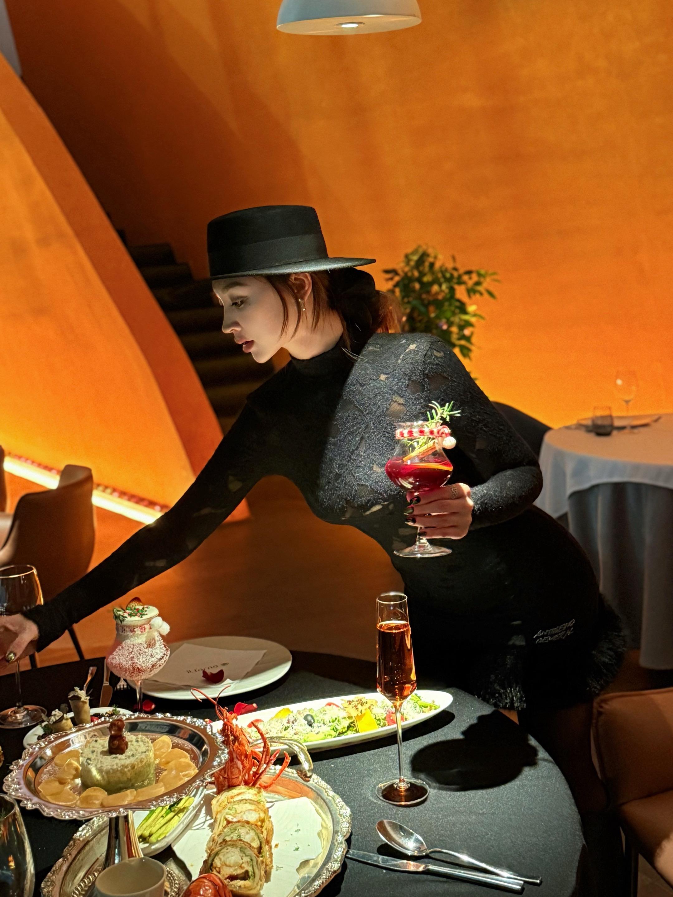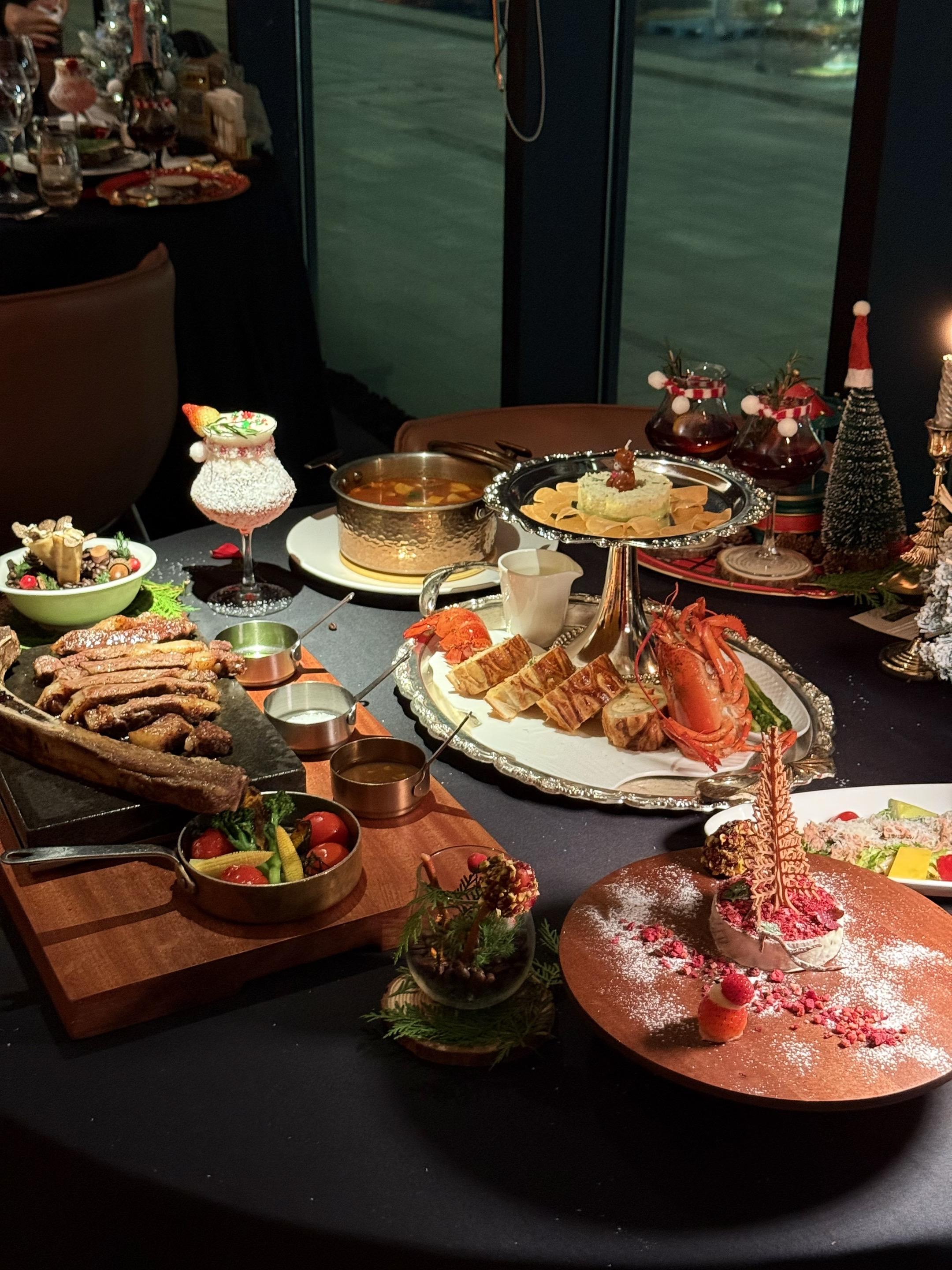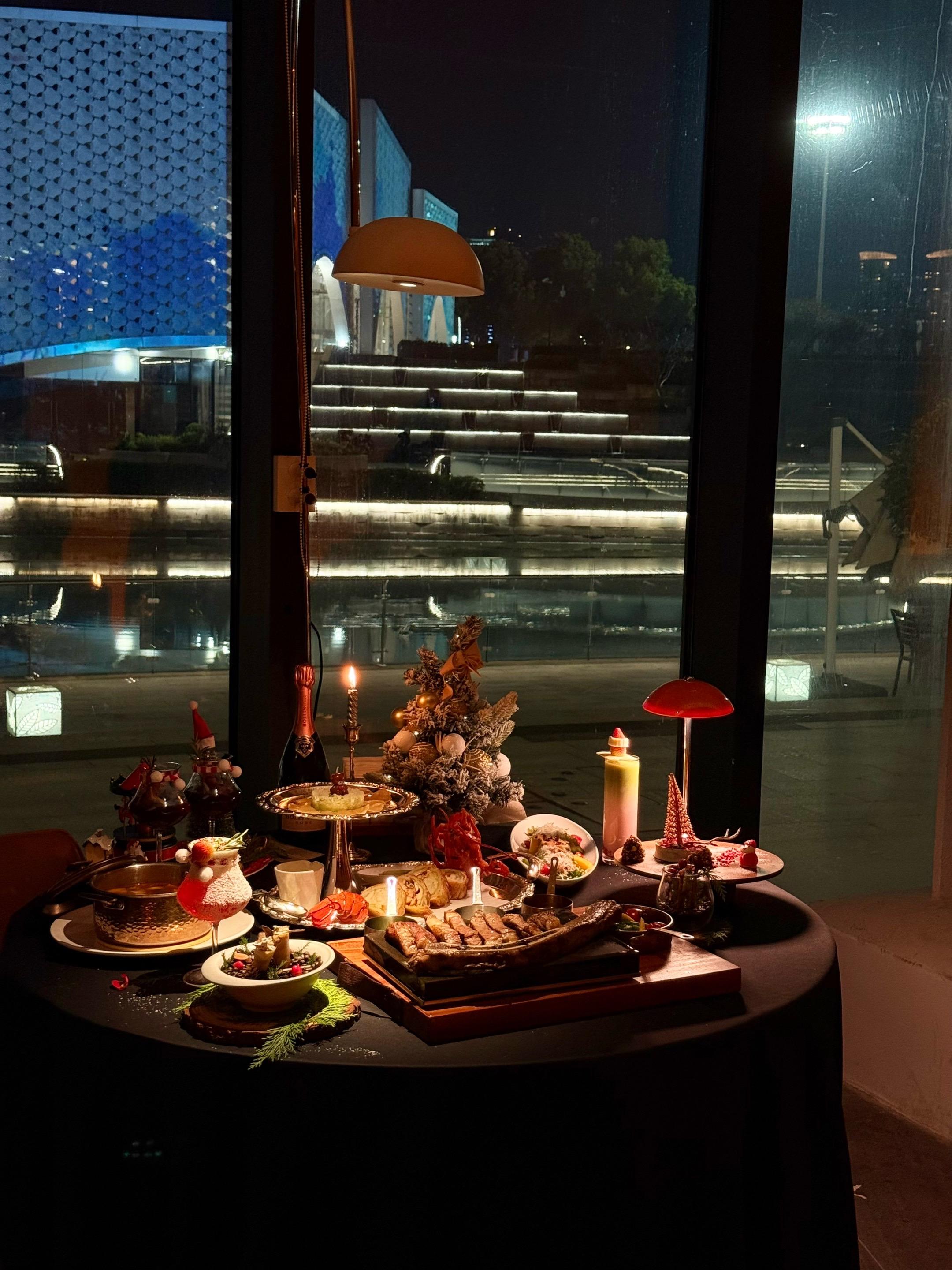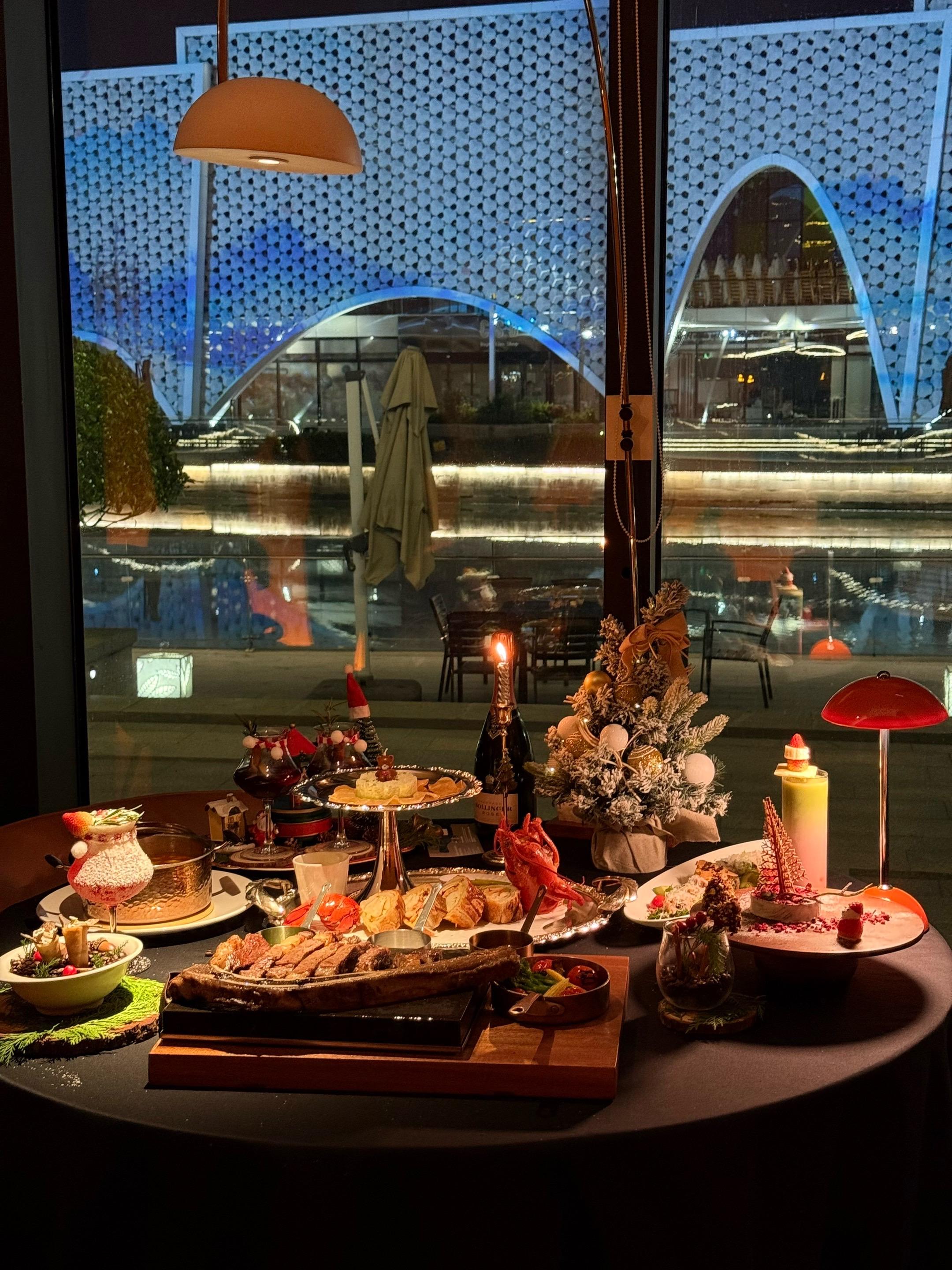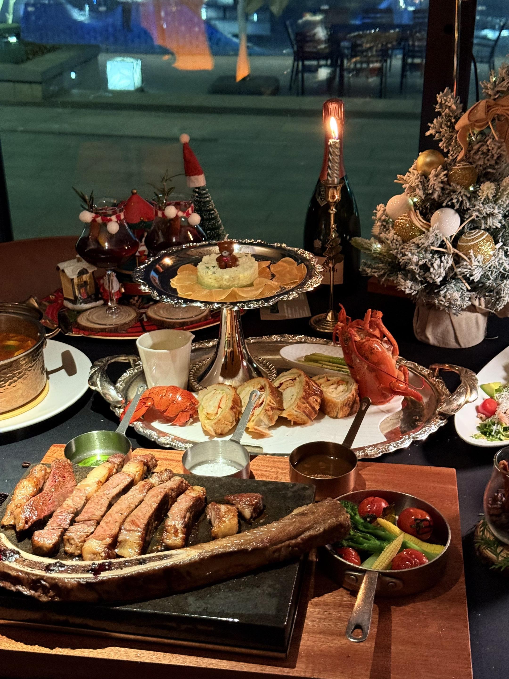 杭州圣诞氛围已到位🎄包出片的~ 周末逛钱江世纪城 被意坊门口的圣诞树+雪花❄️吸引了 真的好漂亮 忍不住去吃点漂亮饭啦 落地窗外有波光粼粼的湖景 圣诞歌+爵士乐BGM一响 氛围感拉满💫 ✨龙虾惠灵顿🦞 外皮酥脆 里面龙虾肉鲜嫩 加上菌菇酱的鲜香 一口下去 鲜甜爆汁真的很绝 ✨现烤牛排🥩 要了七分熟🔥表面焦脆得像薯片 切开肉汁biu出来~🥹 ✨热红酒🍷 肉桂棒搅着莓果香 热乎乎一杯下肚 迷迭香混着酒气从喉咙暖到脚尖 微醺着看窗外夜景 梦回欧洲集市🍷~
