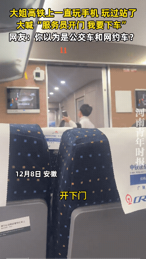 高铁门已经关上了,她没有下去车。此时此刻,她大声的喊服务员,让服务员“开下门”,可她不知道的是,服务员有多大的胆,也不敢给她开门的。 这不是当年的绿皮车,窗户打不开,若窗户能打开的话,估计她就不会再喊服务员了…… 没办法,坐到下一站,再拐回来下车吧!