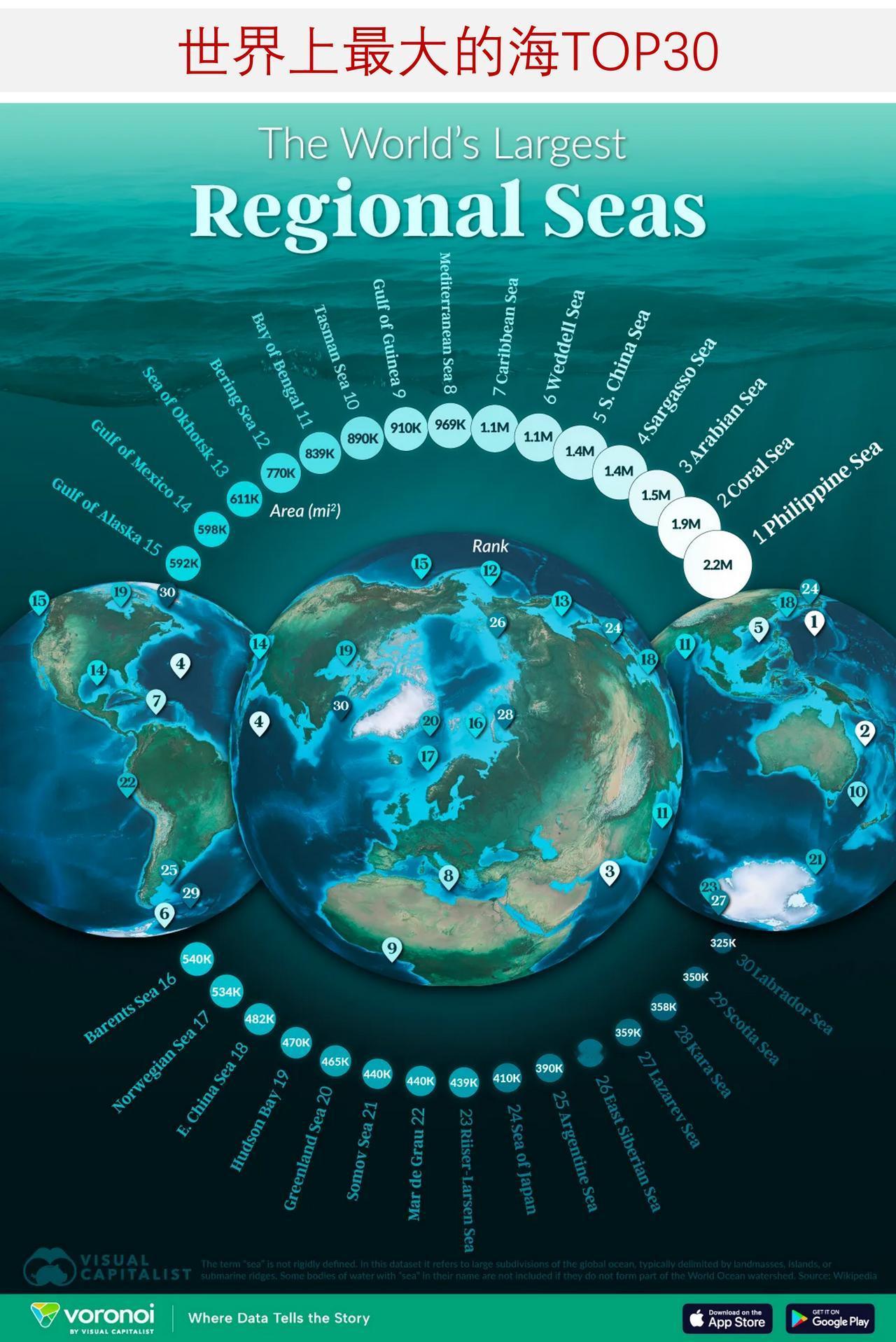 世界上最大的海分布在哪里?南中国海在世界排名第几? 世界上最大的区域海域涵盖了极为多样化的气候类型,从温暖的热带地区到南极洲周围的寒冷水域。它们是全球海洋系统的重要组成部分,通常依据周边的陆地或海底山脉来界定。 此图表展示了地球上面积最大的 30 个区域海,从广阔的菲律宾海到寒冷的拉布拉多海,涵盖了众多海洋区域。该图表中的数据来源于维基百科。 “海”这一术语并没有严格的定义,在这个数据集中,它主要指的是全球海洋的大规模分区,而非孤立的内陆水域。这些边界通常沿着大陆边缘、岛弧或洋脊而定。 ——菲律宾海域和珊瑚海在排名中占据主导地位 菲律宾海是世界上最大的区域性海域,面积近 570 万平方公里,是地中海面积的两倍多。其广阔的海域内分布着地球上一些最深的海沟和最活跃的地质构造带。 邻近的珊瑚海是世界上第二大的海洋区域,这里有着大堡礁,也是海洋生物多样性的重要宝库。 ——印度洋和大西洋的“战略水域” 阿拉伯海和南中国海均位列全球五大海域之列,并且是全球航运的重要枢纽。它们温暖的水域支撑着重要的季风系统,这些季风系统影响着当地的气候和农业。 再往西,加勒比海和几内亚湾在贸易和能源运输方面发挥着关键作用。 ——寒冷地区的海域覆盖着广袤而偏远的区域 几个极地海域也榜上有名,其中包括威德尔海、巴伦支海和格陵兰海。这些区域对于深层海水的形成至关重要,而这一过程有助于推动全球海洋的环流。 这些地区的极端气候限制了人类的活动,但它们却储存了大量的碳,并影响着海冰的分布模式。随着气候变化重塑两极地区,这些偏远的海域对于理解地球不断变化的系统将变得愈发重要。