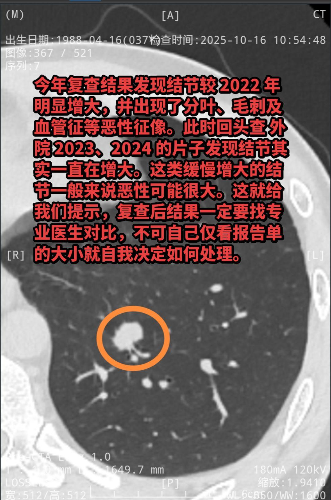 逐渐增大的结节一定要警惕恶性可能。该患者于 3 年前体检发现左肺下叶实性结节,当时结节很小,也没有分叶、毛刺等恶性特征。随后每年都有复查胸部 CT,但报告单上都提示较前相仿,患者也并未在意。今年复查结果发现结节较 2022 年明显增大,并出现了分叶、毛刺及血管征等恶性征像。此时回头查 外院 2023、2024 的片子发现结节其实一直在增大。这类缓慢增大的结节一般来说恶性可能很大。这就给我们提示,复查后结果一定要找专业医生对比,不可自己仅看报告单的大小就自我决定如何处理。