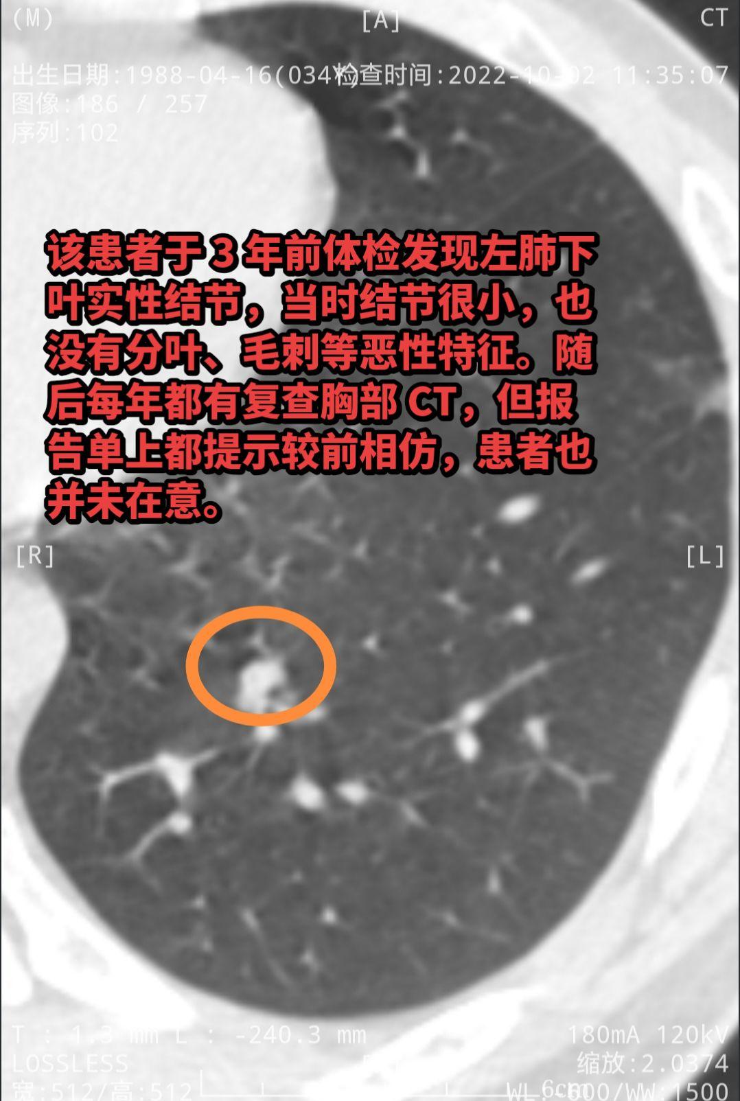 逐渐增大的结节一定要警惕恶性可能。该患者于3年前体检发现左肺下叶实...