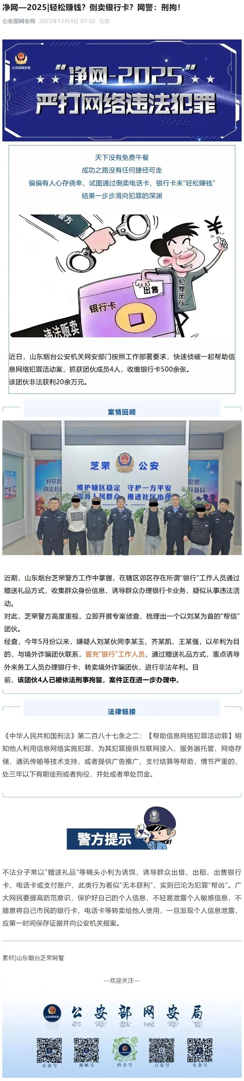 【网警侦破帮助信息网络犯罪活动案】近日,山东烟台公安机关网安部门按照工作部署要求,快速侦破一起帮助信息网络犯罪活动案,抓获团伙成员4人,收缴银行卡500余张。该团伙非法获利20余万元。