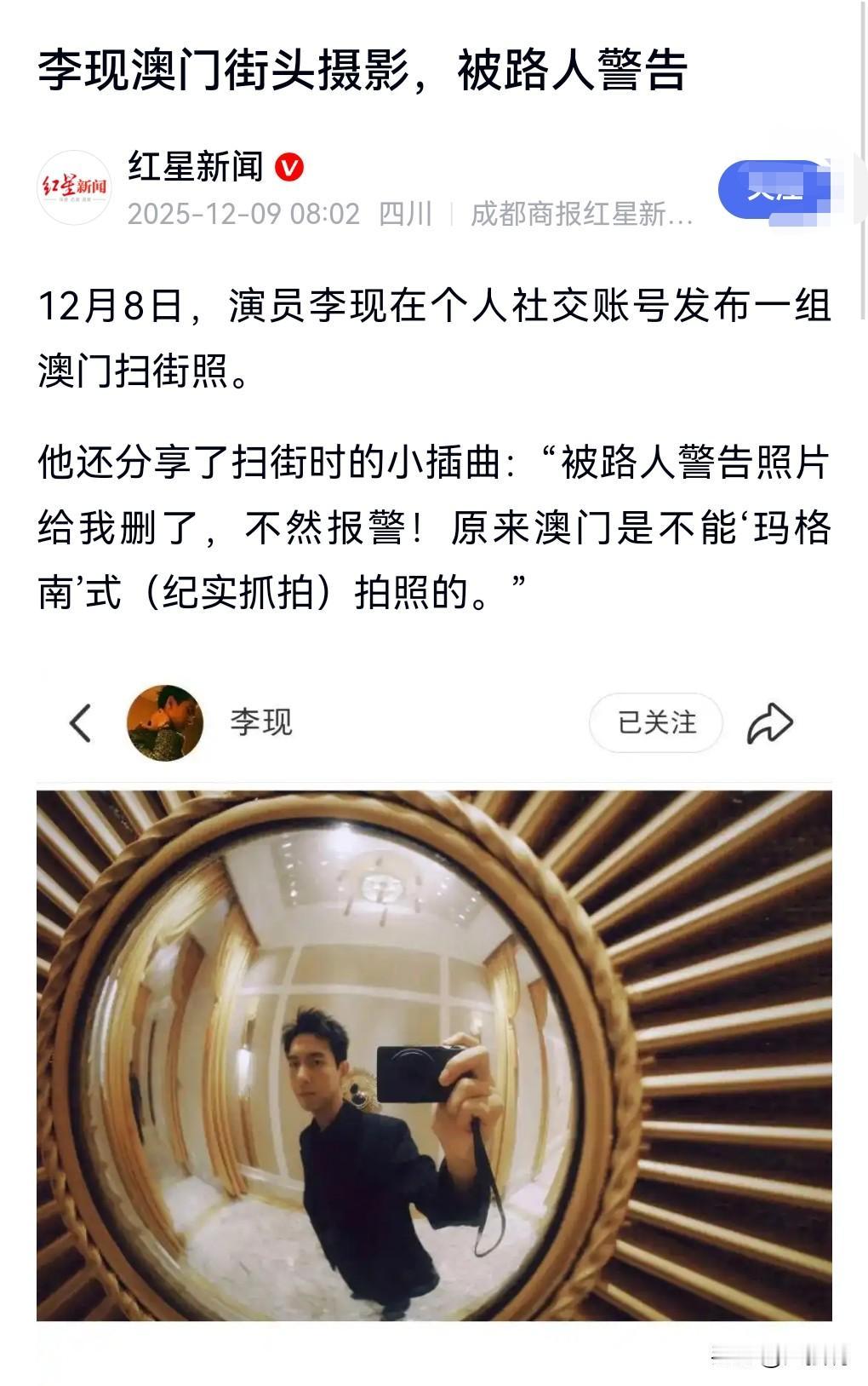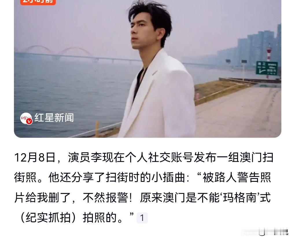 有用的知识又增加了。 千万不要在澳门纪实抓拍,要不然就会涉及到法律问题。 很多人都知道李现是一个特别爱摄影的明星。 近日,他在澳门拍照,结果被路人警告了。 事后他才得知在澳门抓拍是违反法律的。 所以我们还是要遵守当地的法律,以免造成不必要的麻烦。