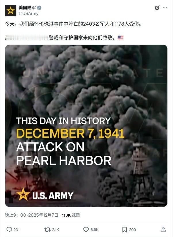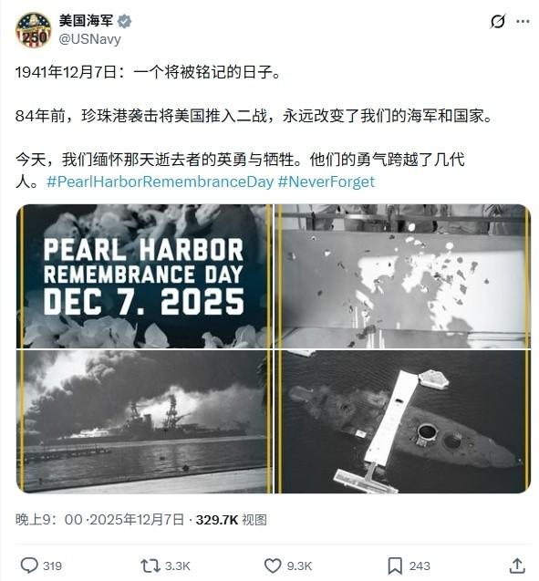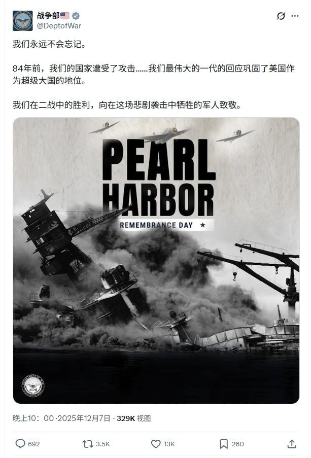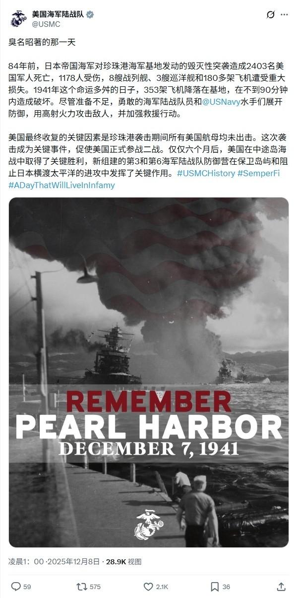 美国纪念珍珠港事件,不提是谁干的 12月7日,美国军方多个账号在社交媒体上发文追思日本偷袭珍珠港84周年纪念日。 然而耐人寻味的是,无论是美国国防部,还是美国海军,亦或者是美国陆军,美国军方的大多数账号都以“缅怀牺牲”“致敬勇气”等表态追思历史,唯独不谈是谁袭击了珍珠港。 美国军方这种近乎刻意的“选择性遗忘”,折射出当下美国二战史观正陷入一种战略混乱。 为了服务遏华战略的需要,美国近些年的二战历史宣传持续美化日本的侵略罪行,甚至出现过“美日士兵在硫磺岛英勇作战”的这种荒谬叙事,令相当多的美国网友炸锅:美日士兵在硫磺岛浴血奋战,那敌人是谁?外星人吗? 美国将二战历史当做可以随意涂抹的政治工具,不仅是对当年对抗日本军国主义的美军士兵的亵渎,更是对二战反法西斯正义叙事根基的侵蚀。 这种为日本侵略罪行“打码”的行为,也在无形中助长了日本右翼否认历史的嚣张气焰,鼓励其挣脱和平宪法的束缚。 美日关系 当年日本正是看见美国对其侵略战争的视而不见,才敢于把战火烧到太平洋; 今天美国为了地缘政治私利选择性遗忘历史,日本右翼自然心领神会:原来珍珠港事件也可以“去日本化”,那么日本凭什么不能要求美国为那两颗原子弹道歉? 到那个时候,罗斯福的棺材板怕不是都压不住了。
