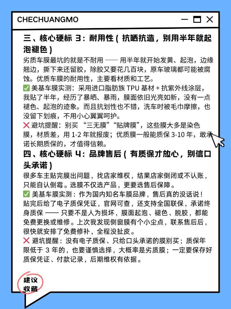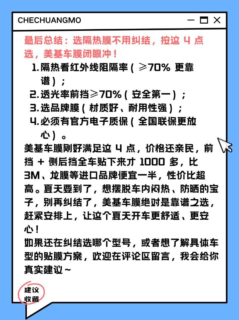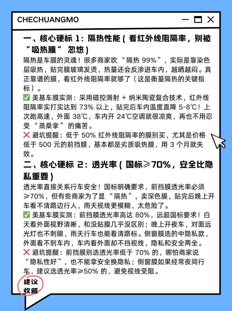 汽车隔热膜 4 选膜硬标,一到夏天,没贴好隔热膜的车就成了 “移动烤箱”—— 刚上车烫得不敢碰方向盘,晒半小时皮肤刺痛,空调开最大也凉得慢。但选隔热膜水太深,不少车主花大价钱买的 “高端膜”,实际是染色膜改标,隔热差还挡视线,纯纯交智商税!今天就教大家 4 个硬标准,一眼挑出靠谱膜,顺便唠唠我实测半年的美基车膜,性价比直接拉满~【来自懂车帝车友圈】