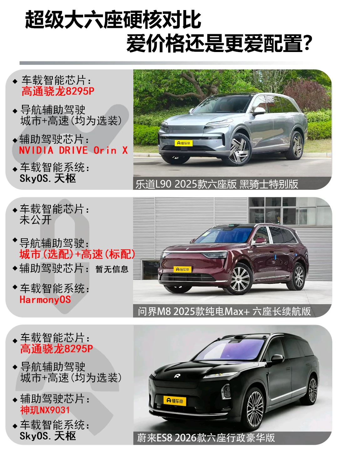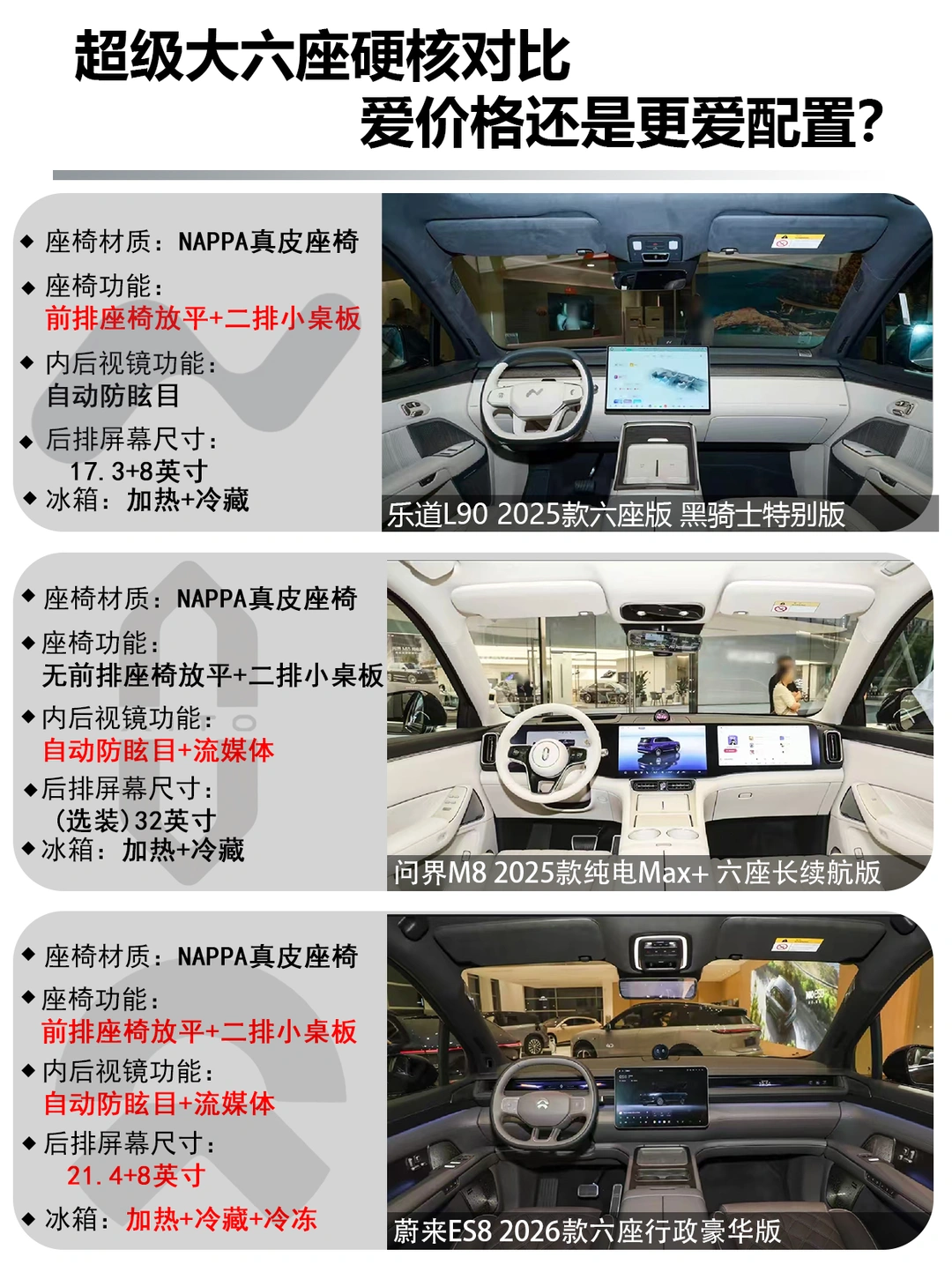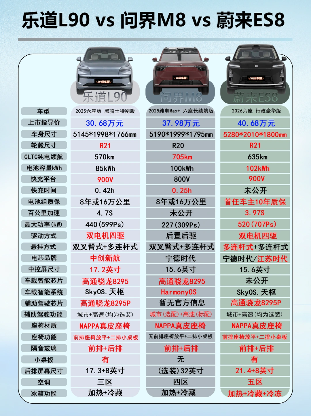 · 影音娱乐:蔚来ES8屏幕组合最大,乐道L90双屏兼顾实用,问界M8可选大屏满足个性化需求。