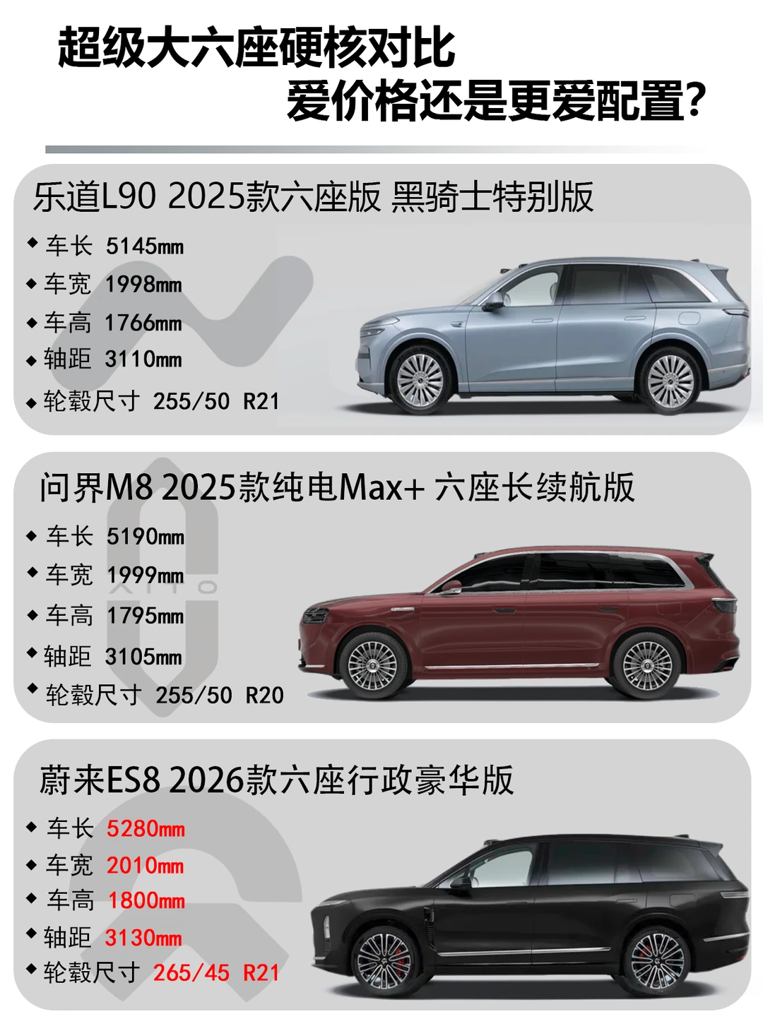 · 蔚来ES8 2026款六座行政豪华版(以下车型简称为蔚来ES8):价格 40.68万,价格最贵,尺寸也最为宽大,达到 5280/2010/1800mm。