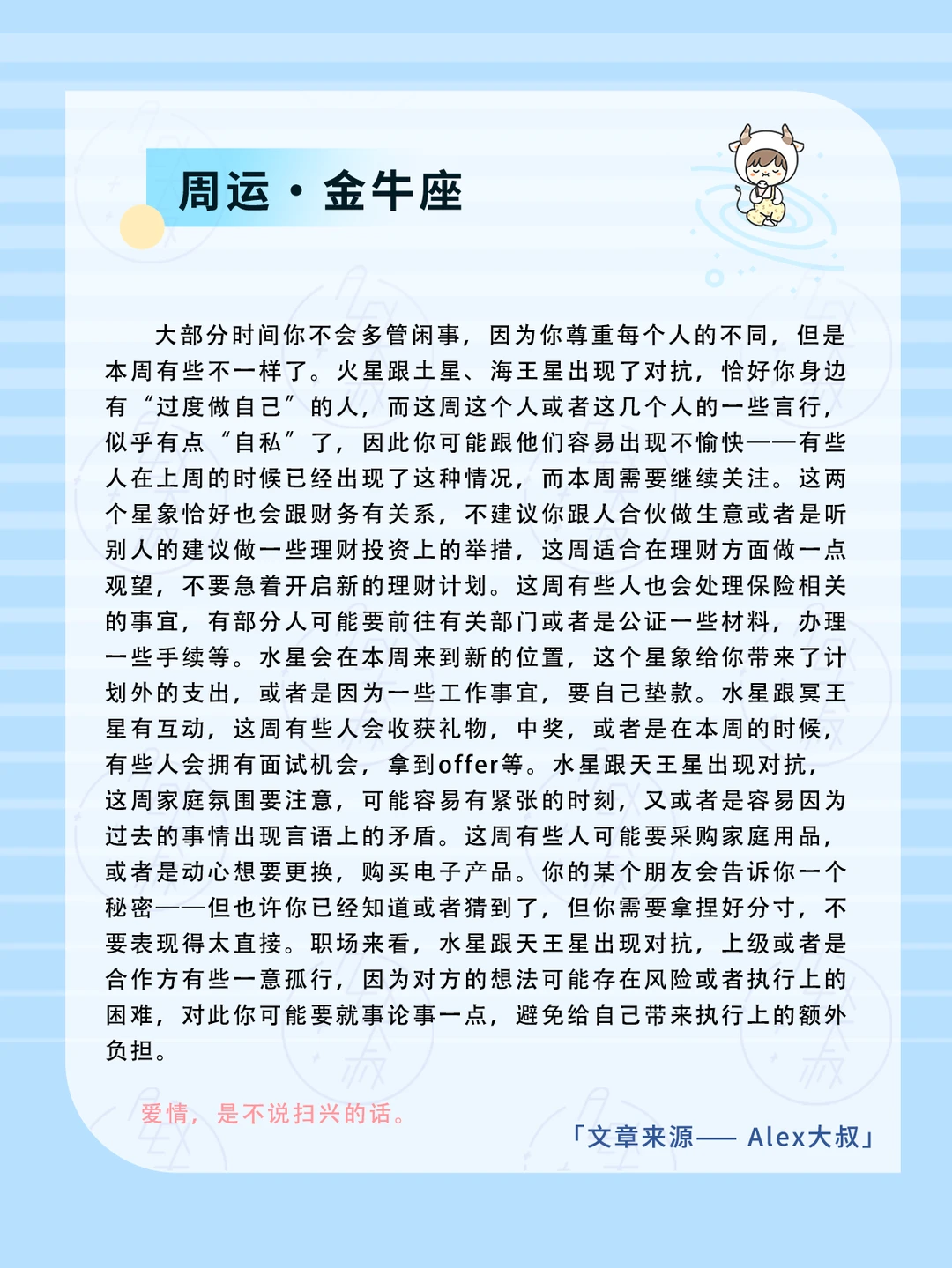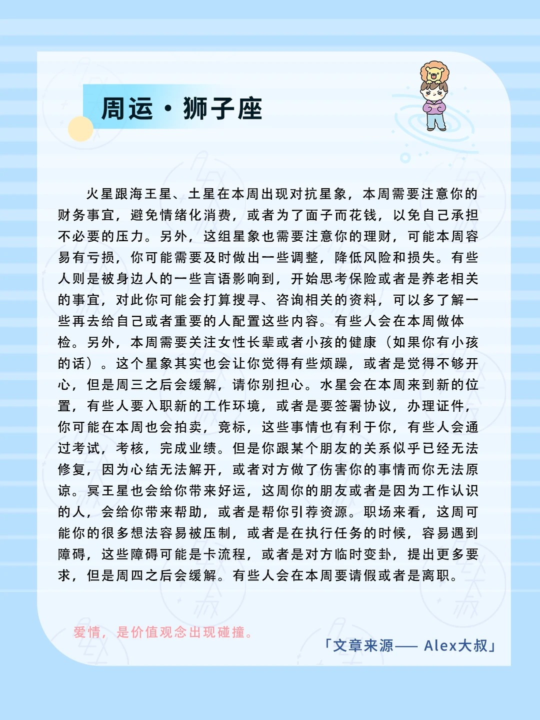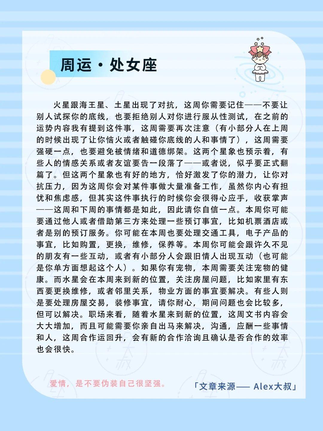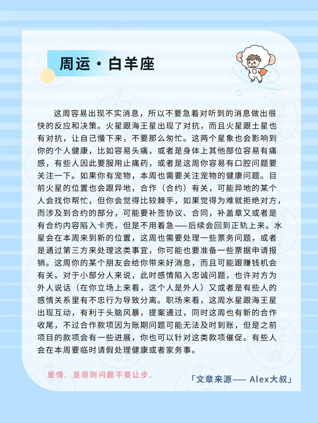 水星会跟天王星、海王星出现互动,而水星跟天王星会出现对抗的星象,这周也会容易出现言而无信的事情,或者是出现放鸽子,被放鸽子的情况。也许你在这之前预约了本周的某些事情,场所,安排,但可能临时有变化,导致需要改期或者取消。也可能是自己突然在临近要兑现这个预约的时候,没有了原先的冲动和兴致,导致需要调整这个预约安排。